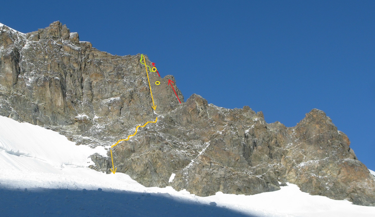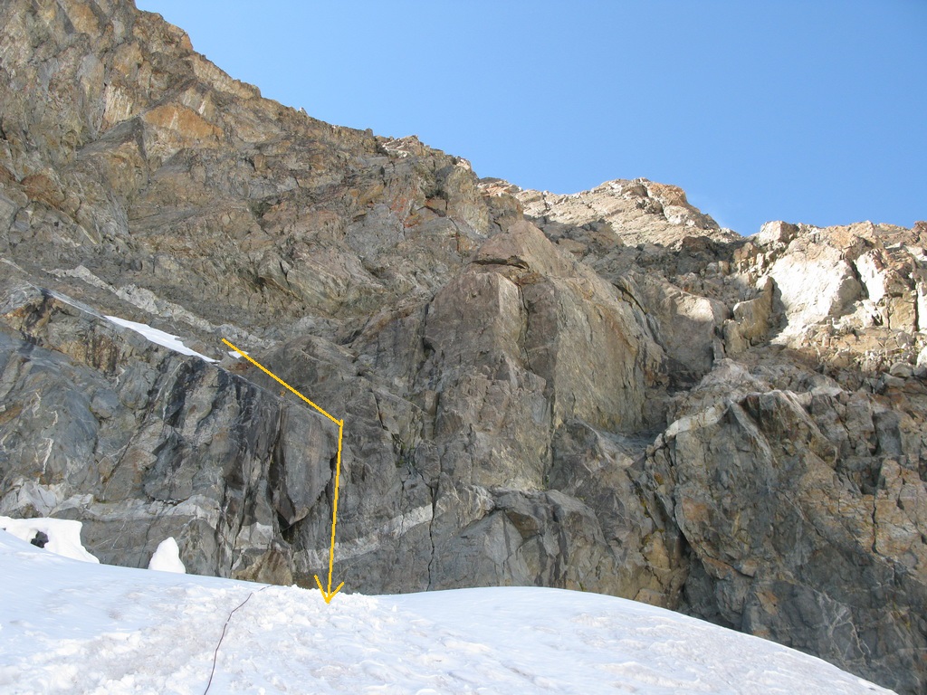 Nástup na hrebeň je úplne vpravo zo snehového sedla. Žlté krúžky označujú lezcov ktorí sú v nesprávnej línii. Správne je na hrebeni.