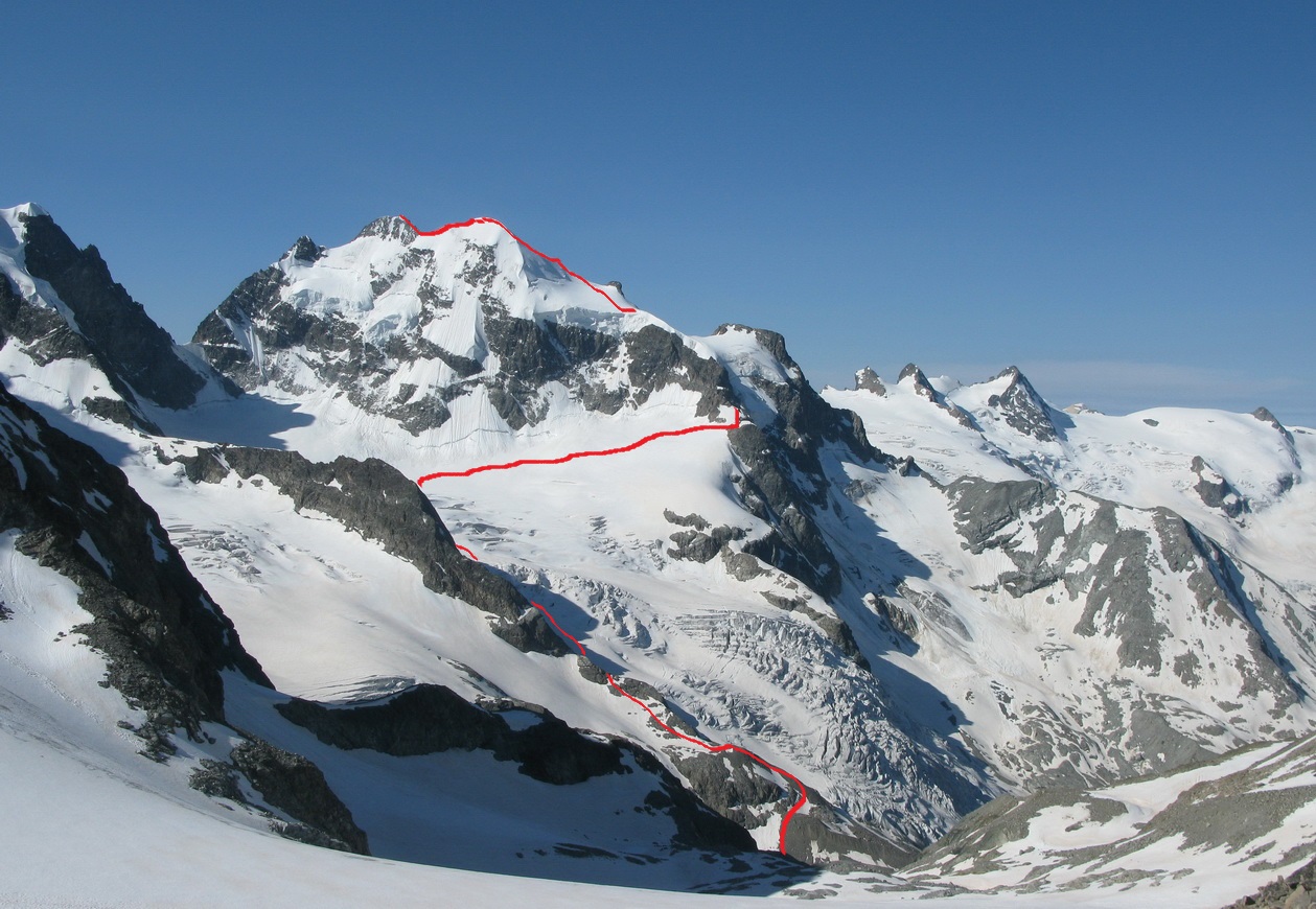 Samotný Piz Roseg má dva vrcholy. Schneekuppe 3918m. a hlavný vrchol Roseg 3938m. Na hlavný vrchol vedie exponovaný hrebeň obtiažnosť ktorého určujú podmienky a preto sa ľudia často uspokoja aj s dosiahnutím ľadového vrchola Schneekuppe.