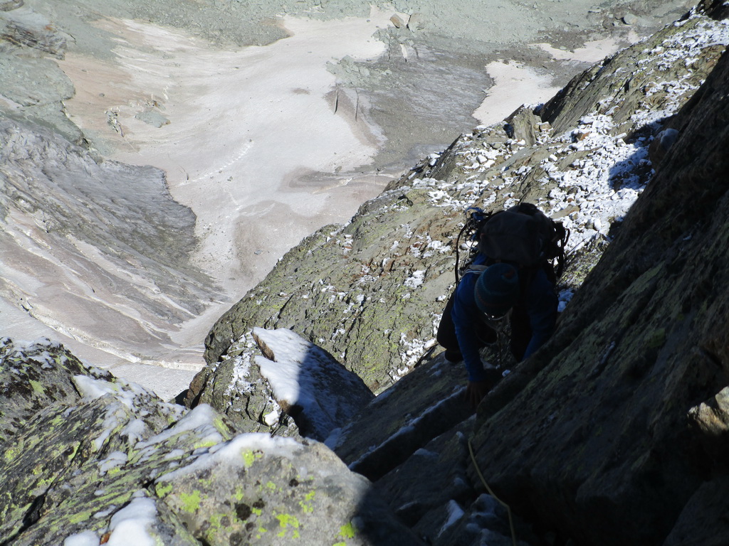 Ďalším kľúčovým miestom je nepríjemný traverz poslednej veže zo západnej strany. Tu som zase naopak ocenil mačky, v tieni sa sneh udržal na skale.