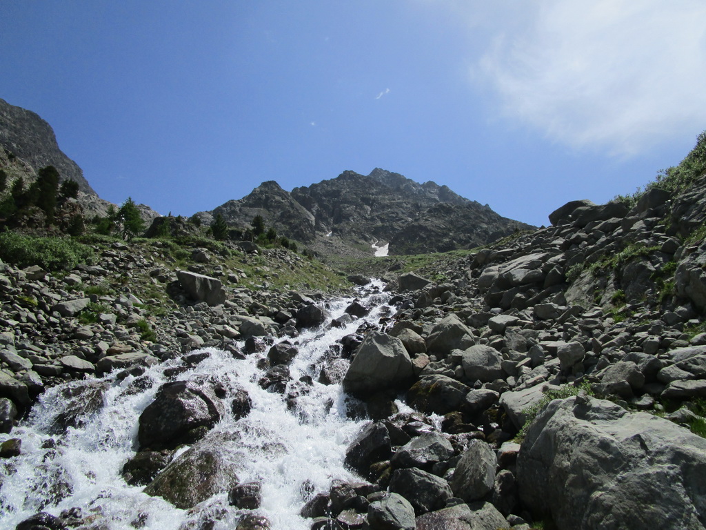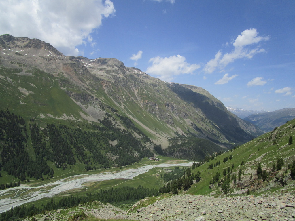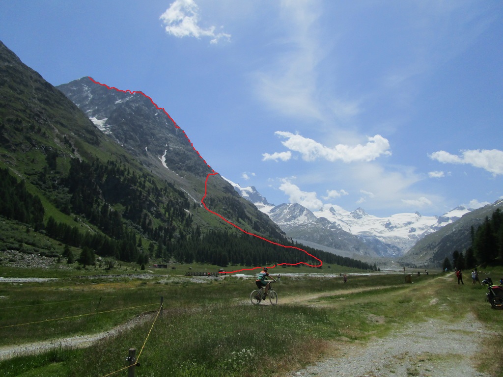 Vyrazil som najprv po značkovanom chodníku smer chata Tschierva. Na mostíku vedúcom cez potok tečúci z ľadovca Misaun som odbočil vľavo a vybral sa hore po rozbitom pravom brehu potoka. Nad hranicou lesa som ešte nabral vodu a odbočil som od potoka smerom do prava.