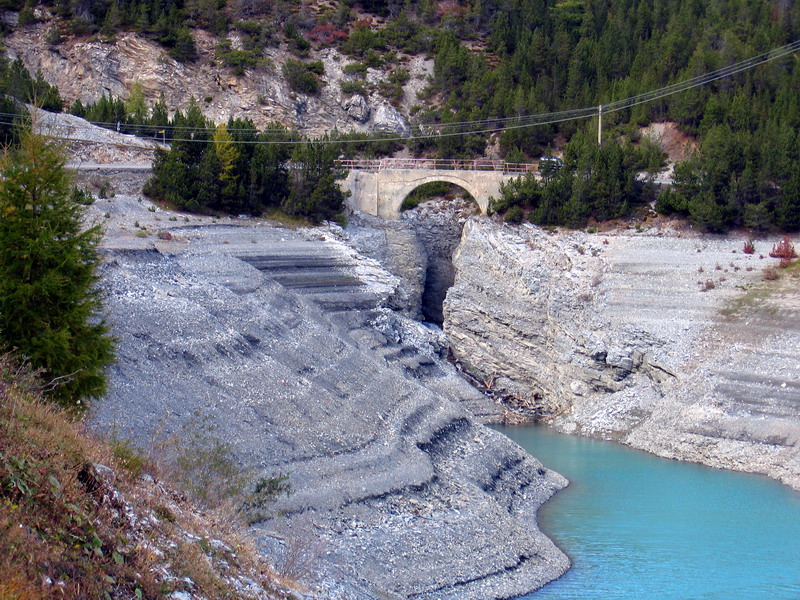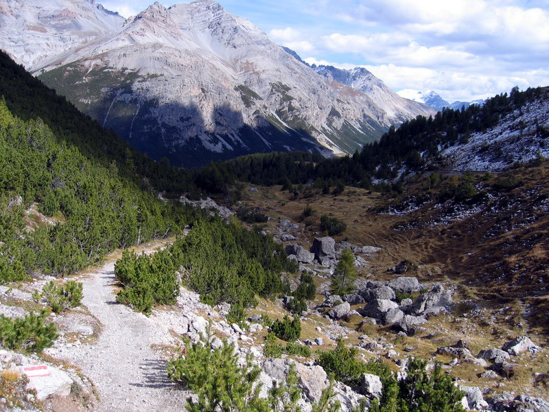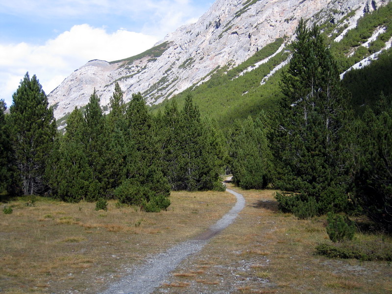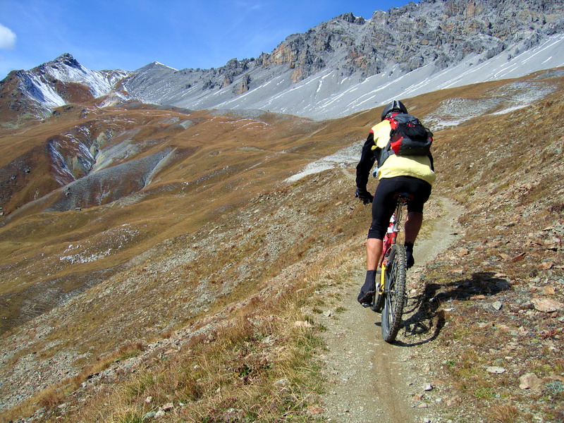 Po priehradnom múre prejdem na druhú stranu a druhé, menšie jazero už obchádzam zľava. Pôvodný plán cez Val Alpisella prísť až do Livigna musím zmeniť, keď však prichádzam k ústiu doliny a zbadám značku miestneho bikového maratónu (celoročne značená trať), tak neodolám a vydám sa po nádherných serpentínach do doliny. Rozhodnem sa, že vyjdem po sedlo a tam sa otočím. Pred záverom stúpania zbadám na opačnej strane doliny úzky chodníček. Dostávam hneď zákerné myšlienky spustiť sa naspäť po ňom, namiesto cestou po ktorej som prišiel. Hore hodím ešte kontrolný pohľad do mapy a už zjazdujem po nádhernom chodníčku.Za chvíľu som zase dole pri priehrade - táto odbočka teda stála za to. Do Livigna sa musím isto niekedy pozrieť. Zozadu ma dobiehajú dvaja bikery, ktorých som stretol v sedle, musia byť prekvapení, lebo zo sedla sa púšťali predo mňou po klasickej ceste. Do debaty sa však nepúšťame, naše cesty sa vzápätí rozdelia. Oni robia okruh okolo jazera a ja pokračujem ďalej.