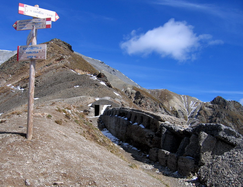 Prechádzam hranicu zo Švajčiarskom, nikto tu nie je a za ňou asi 200 metrov odbočujem vľavo na úzky chodníček smer sedlo Bocchetta di Forcola. Traverzom sa dostanem až pod sedlo, záverečný výšvih musím tlačiť. Je to len kúsok a už som hore. V sedle sú viditeľné zvyšky opevnenia z prvej svetovej. Za ním je vidieť ruiny budovy, pravdepodobne kasárne. Je to záruka toho, že nasledujúci trial bude zjazdný - tí vojaci sa tu museli predsa nejak dostať.
