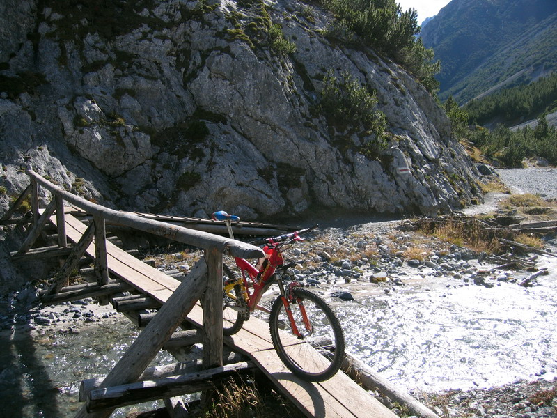 Záver doliny tvorí pekná rovina s nádherným chodníkom vedúcim cez borovicové lesy. Zaujímavé je , že sedlo, ku ktorému vzápätí prichádzam je vlastna nižšie, ako jazero "dole" v doline. Sedlo vlastne ani nie je sedlo, len tabuľka na lúke. Takto sa ocitám v legendárnej Val Mora. O nej mi jeden domáci zo Suldenu pred pár dňami vravel: "Tam musíš ísť!" Tak som teda tu a rútim sa úzkym chodníčkom. Ide to rýchlo vďaka takmer hladkému povrchu. Prvé kilometre doliny vychutnávam zjazd a len dva razy sa prinútim zastať a cvaknúť foto. V závere kaňonu prejdem cez drevený mostík a po pár sto metroch trial končí. Pokračujem po širokej ceste vedúcej lúkami a pasienkami. Kravy sú už dole , takže ma nebrzdia žiadne ploty. V strede doliny je niekoľko krátkych stúpaní. Nie je to žiadna rovina a ja pozerajúc na hodinky už nedočkavo vyzerám záverečný zjazd do švajčiarskej dedinky St. Maria v Munstertali. Konečne sa začne dolina zvažovať a na mňa čaká 1000 v.m. zjazdu neznámym terénom. Vzhľadom na pokročilý čas nevyužívam trialové skratky medzi štrkovými serpentínami, ale si to valím čo to dá po ceste. Ak mi teraz niečo rachne, budem musieť zohnať taxíka, čo ma vezme k autu. Môjmu vyše 10 ročnemu biku už moc nedôverujem.