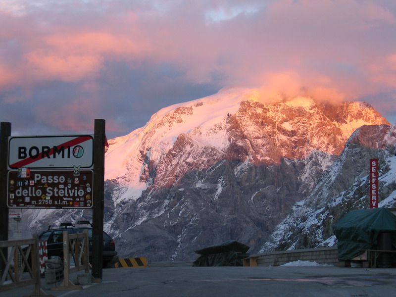 Snažím sa ísť rozumné tempo. Viem, že ma čakajú vyše dve hodinky "do kopca". Prvú hodinu sa mi celkom darí, spravím asi 600v.m. a stihnem ešte aj čo-to zjesť a vypiť. Ako však stúpam hore, teplota klesá a ja idem stále v tieni. Dávam si cieľ: dosiahnuť sedlo, a tam na slniečku si trochu oddýchnuť. Podarí sa mi to po dvoch hodinách stúpania bez prestávky. Som rachnutý a zmrznutý, opatrne rozhýbavam stuhnutý chrbát. Slniečko na ktoré som sa tešil práve zašlo. Musím ďalej, vyťahujem čokoládovú tyčinku a zapijem ju poslednou vodou. Čaká ma posledných 200v.m. na Passo Stelvio. V sedle som asi o štvrť na osem. Slnko tu už nesvieti, ale aspoň si odfotím západom slnka osvetlený Ortler. Dám si na seba všetko oblečenie čo mám a zjazdujem ku autu. Prichádzam k nemu tesne pred zotmením mierne "namrzlý", ale ako sa hovorí:"Koniec dobrý..."