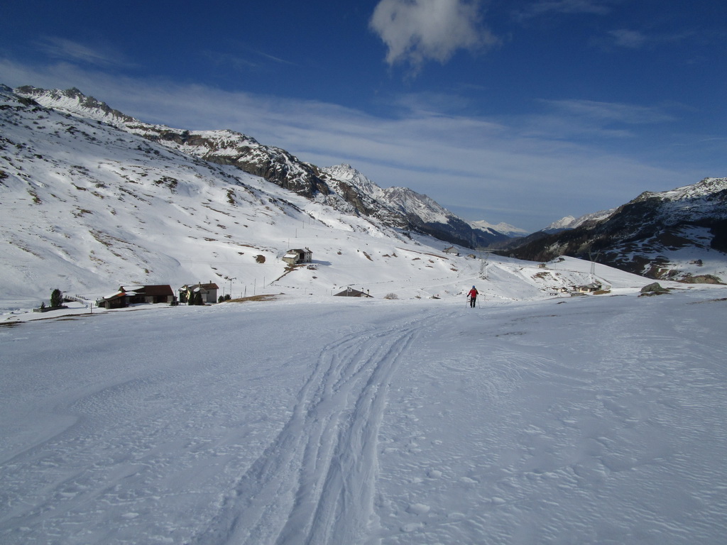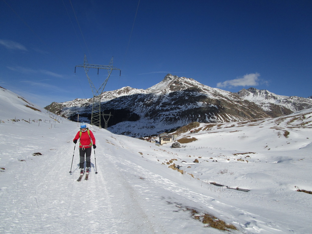 Parkujeme a vyrážame v snehovej biede najprv po poratrakovanej ceste smerom na Septimerpass. Pri prvých usadlostiach odbočujeme cez potok vľavo a po už predšlapanej stope po lúkach pomedzi kamene len mierne strmo vpred - ku našemu dnešnému cieľu: