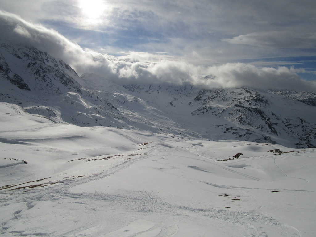 Tie však určite nepanujú v deň nášho výstupu. Po stope prichádzame do sedla. Obdivujeme výhľady na kopčeky ktorým kraľuje Lagrev, Grevasalvas, Coluonas, Piz Julier a kopec ďalších. Záver už miestami sneh vystrieda tráva, terén sa pristrmuje ale počasie aj napriek neskoršiemu času hovorí: "Choďte!"