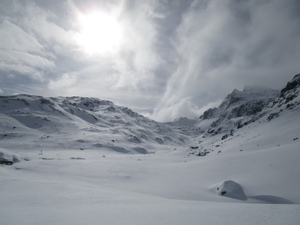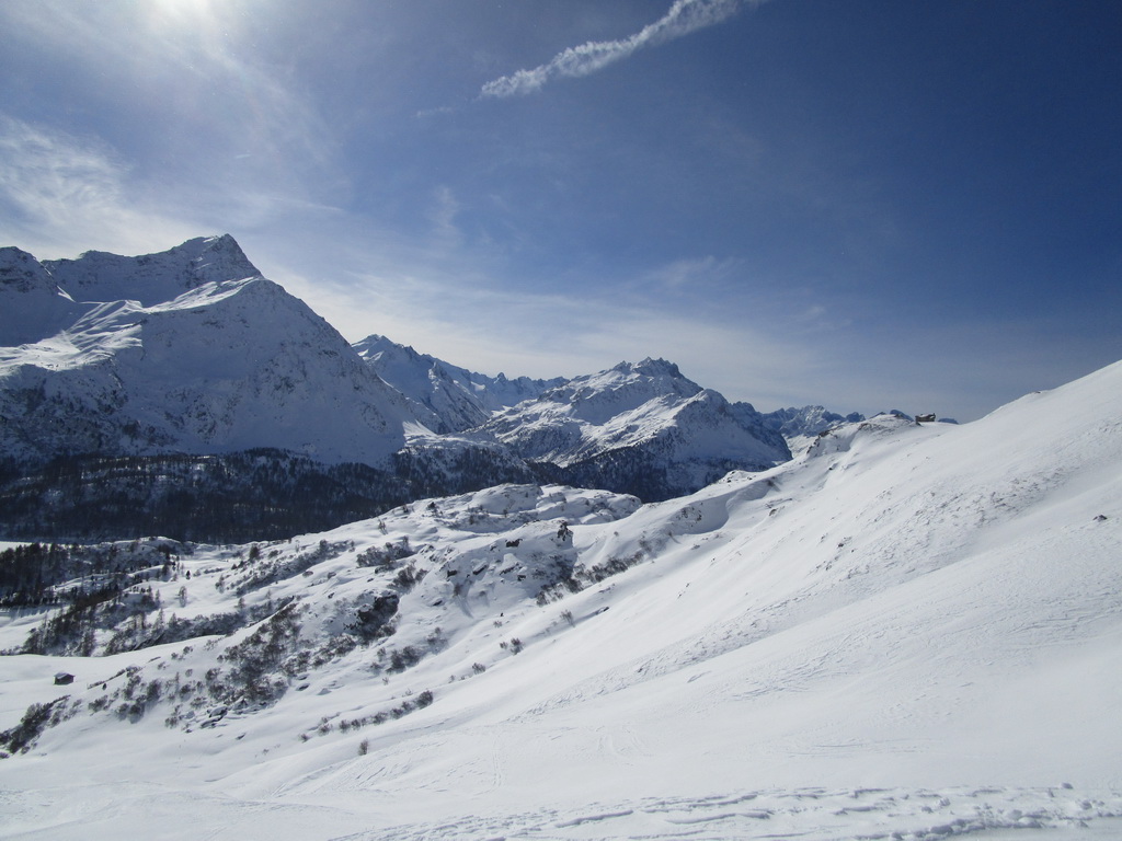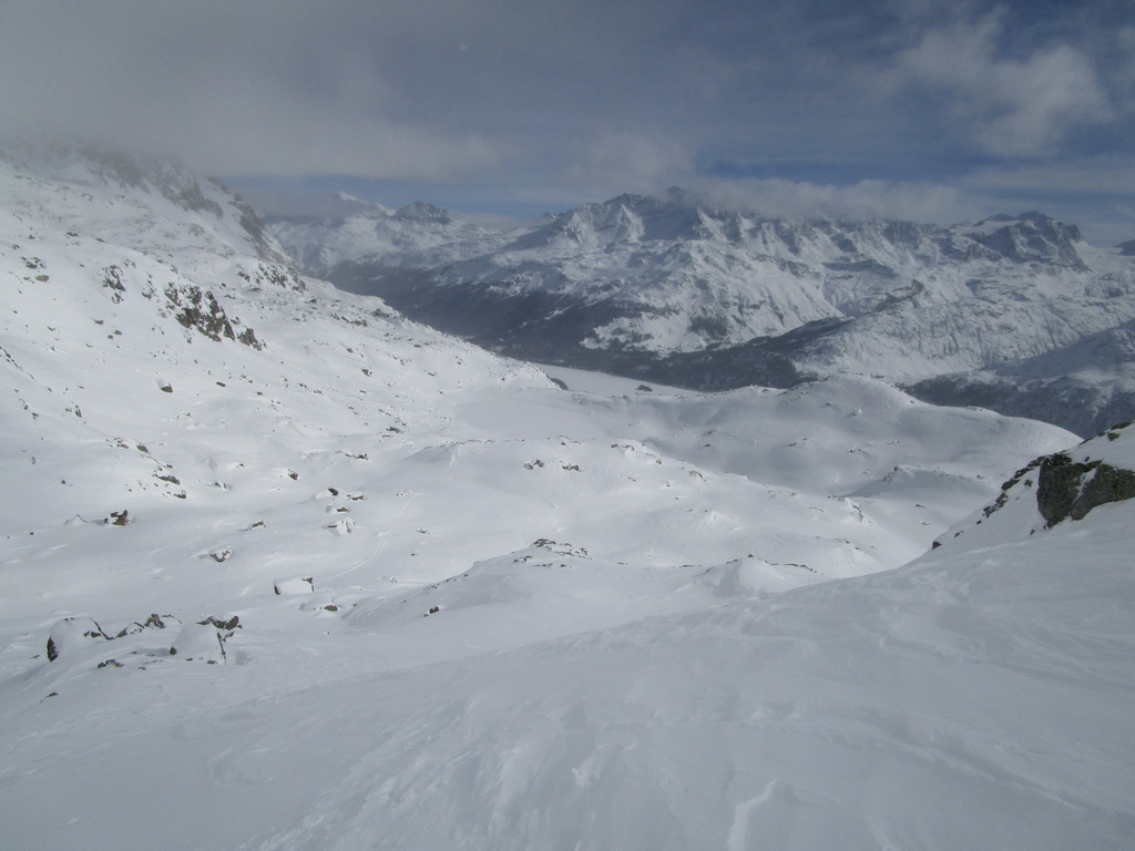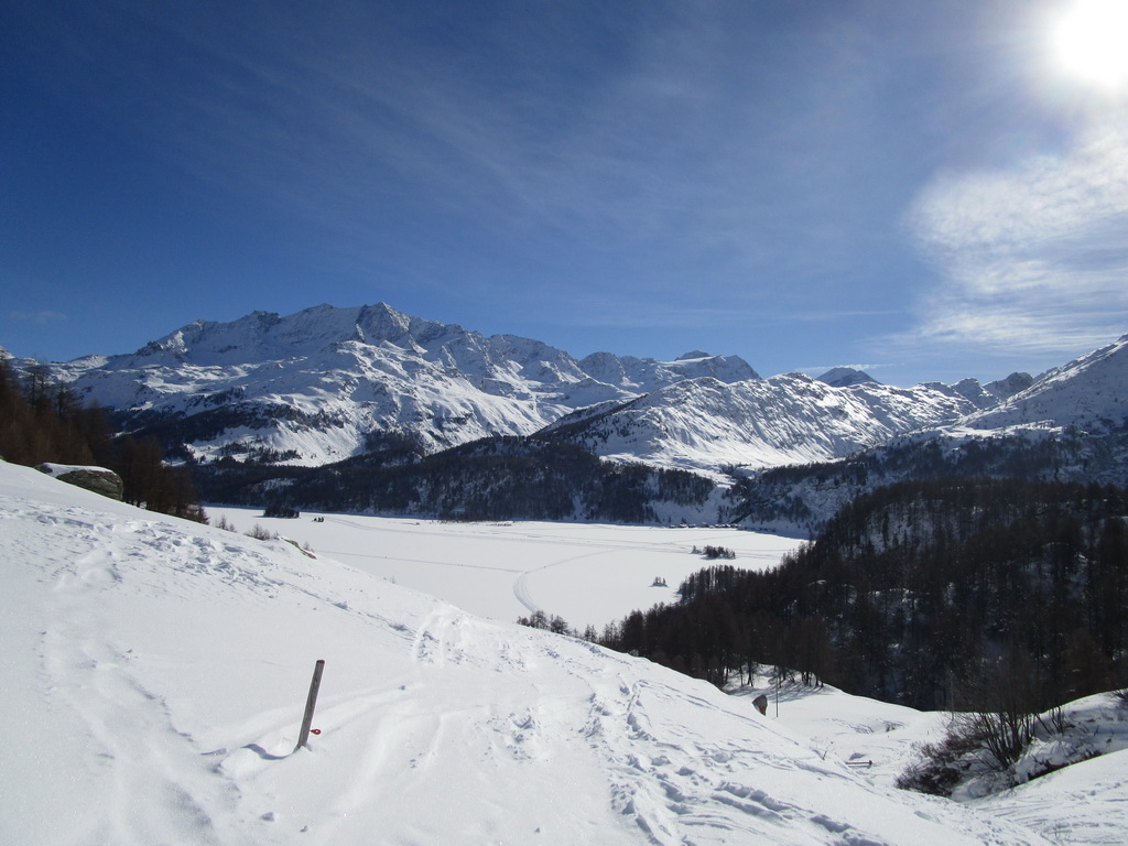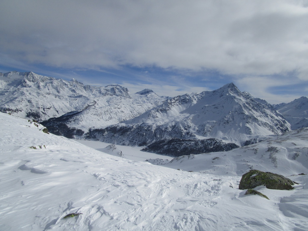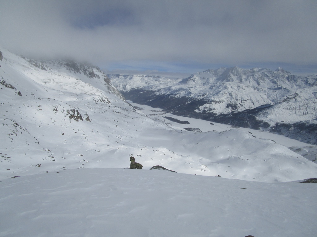 Pri návrate máme možnosť predĺžiť si túru ku sedielku smerom na Piz Lungin. Pásy nalepíme po zlyžovaní spomínaného strmého miesta a krásnou dolinkou na úpätí Grevasalvasu sa dostaneme do sedielka z ktorého je výhľad na Piz Lungin. Skialpová mapa hovorí, že by sa dalo pokračovať až na vrchol.