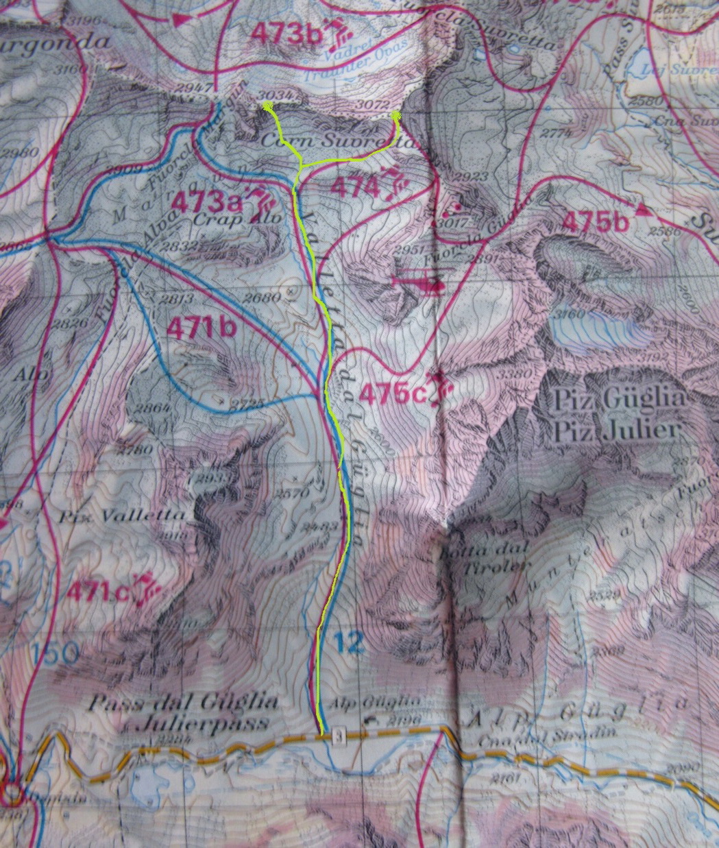 Vyrážame z parkoviska neďaleko Julierpassu (v smere od Silvaplany) smerom do doliny Valletta dal Guglia. Južne orientovaná dolina s mierne strmým stúpaním nás dovedie na nekonečné pláne medzi mohutným Piz Julier a hrebeňom Corn Suvretta - Piz Surgonda. V tomto hrebeni sa nachádza výrazný vrchol Corn Marguns 3034m.. Žlabom v južnom svahu so sklonom cca 40 stupňov na vrchol.