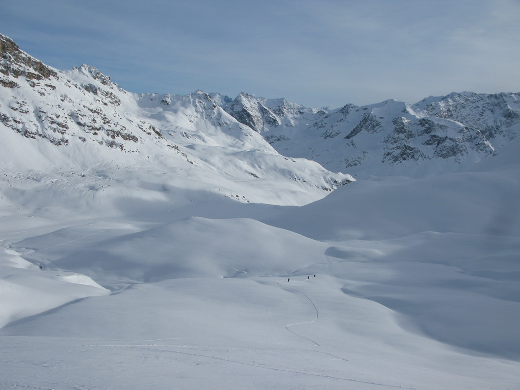 Po dramatickom snežení v posledných dňoch sa hneď deň po skončení sneženia spravilo krásne počasie. Podľa všetkej správnosti by sa deň po takom besnení živlov určite nemalo ísť na lyžiarsku túru a ak, tak len mierne svahy. A také sa dajú nájsť presne v oblasti Julierpassu. Už z auta vidím parkovisko asi s piatimi autami a stopu cik-cakujúcu nad parkoviskom hore. Prvé auto na parkovisku patrí horskému vodcovi. Toto som presne potreboval, pomyslím si. Vyrážam cca o jedenástej.