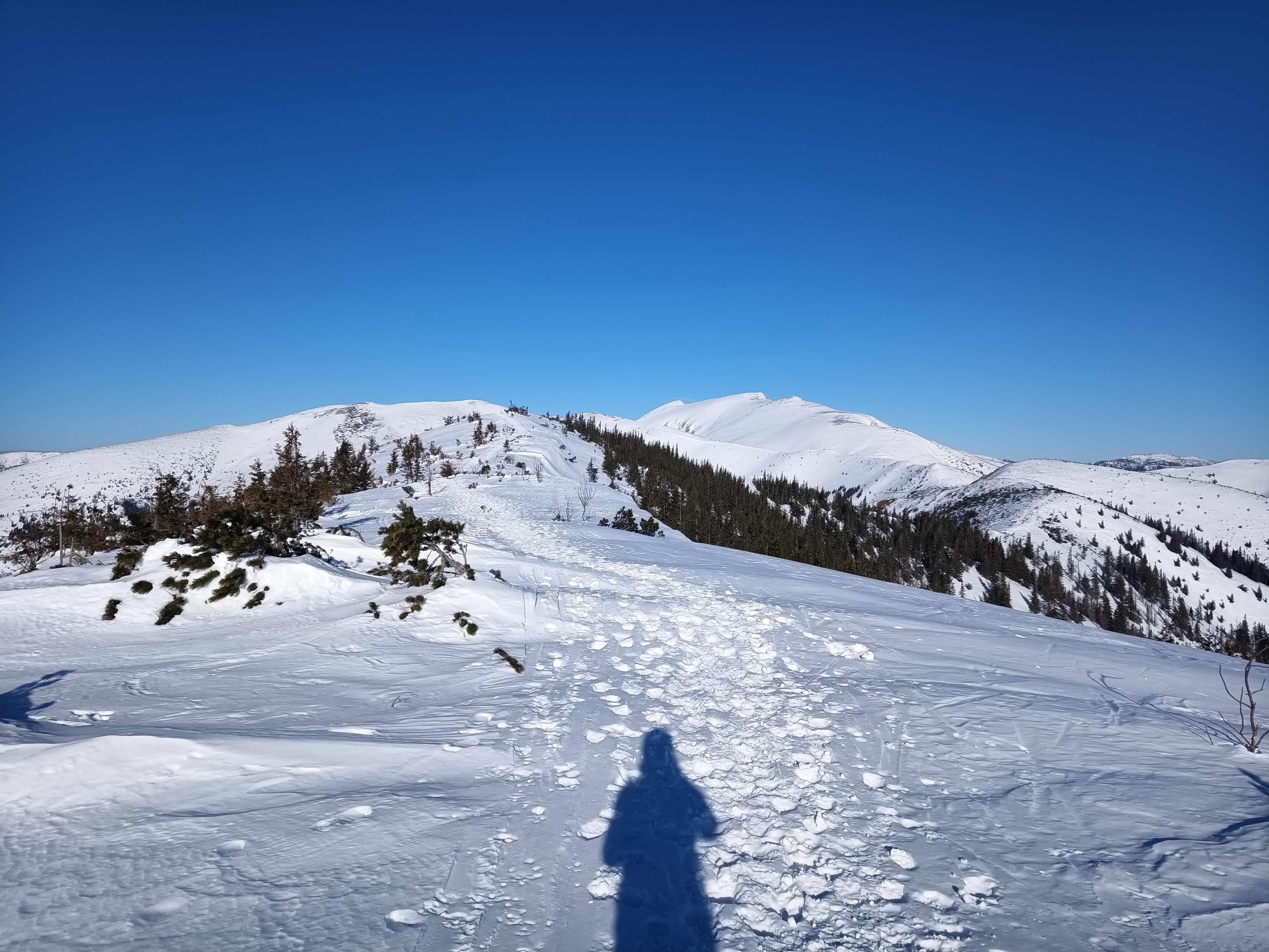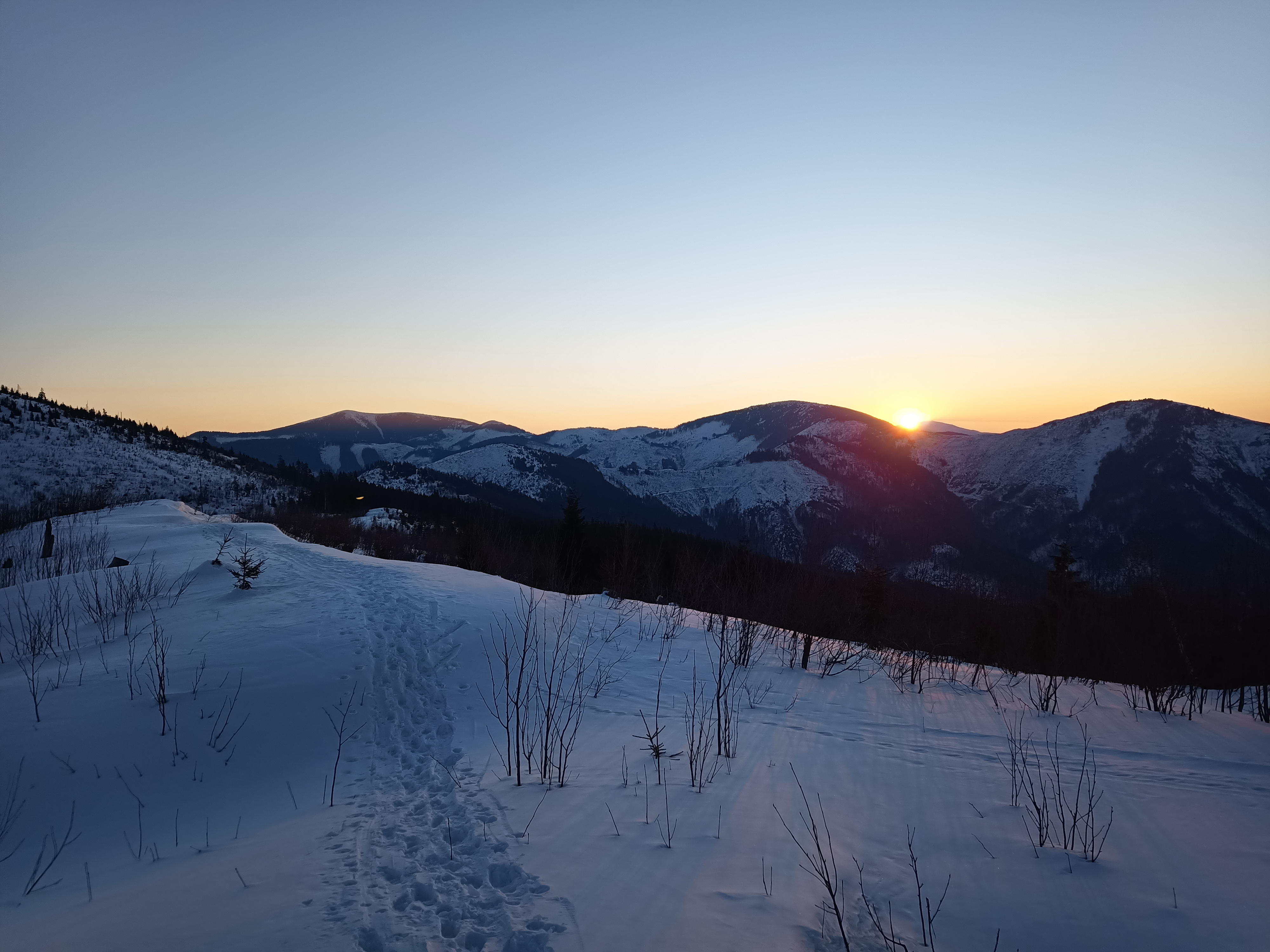 V Priehybe vyťahujem prvú tortilu s kuracím mäsom od polovičky Klaudie (čo by sme bez tých žien robili…), zajedám snickerskou, zapíjam ionťákom, ktorý začína byť v tom mraze riadne chladný, obúvam lyže a fučím hore, strmo na Kolesárovú. Slušný výšľap. Z Kolesárovej je hrebeň už menej jednoznačný, avšak po víkende ostala od zopár pešiakov slušná stopa aj v týchto častiach hrebeňa. Pomerne jednoducho prechádzam cez Oravcovú až na Zadnú Hoľu. Odtiaľ je hrebeň orientačne dosť náročný, avšak niektoré blbé miesta si pamätám avýrazne mi to uľahčuje aj prešliapaná stopa. Tesne za Havraňou poľanou je miesto, kde to treba strhnúť doprava. Viem, že takmer každý sa tu nechá zlákať a neodbočí. Aj prešliapnutá stopa navádza vľavo, ja si to tu našťastie pamätám z minulého roka, keď som tiež poblúdil, a triafam chodník hneď na prvýkrát. V týchto miestach je hrebeň ťažký pre pohyb na lyžiach: dole sa to pustiť nedá, na pásoch to ide ťažko, tak v niektorých miestach vyzúvam a idem pešo s lyžami v rukách. Vedel som, čo ma tu čaká, tak to zvládam pomerne rýchlo. Pred Ramžou opäť miesto, kde to prirodzene ťahá doľava, tento raz sa mi opäť podarí držať chodník a po chvíli som pri útulni Ramža. Je tesne pred východom slnka a ja konečne vypínam čelovku. Viem, že orientačne aj technicky najnáročnejší a úsek celého hrebeňa je za mnou. Kúsok oddychujem, niečo do seba natlačím a vyrážam smer Čertovica, kde mám v pláne dať si kávu a polievku. Okolo Bacúšskeho sedla sa mi prvýkrát ukazuje západná časť hrebeňa Nízkych Tatier s Ďumbierom, sľubujúca konečne aj nejaké výhľady. V Sedle za Lenivou sa napájam na bežkársku trať a poľahky sa púšťam na Čertovicu.