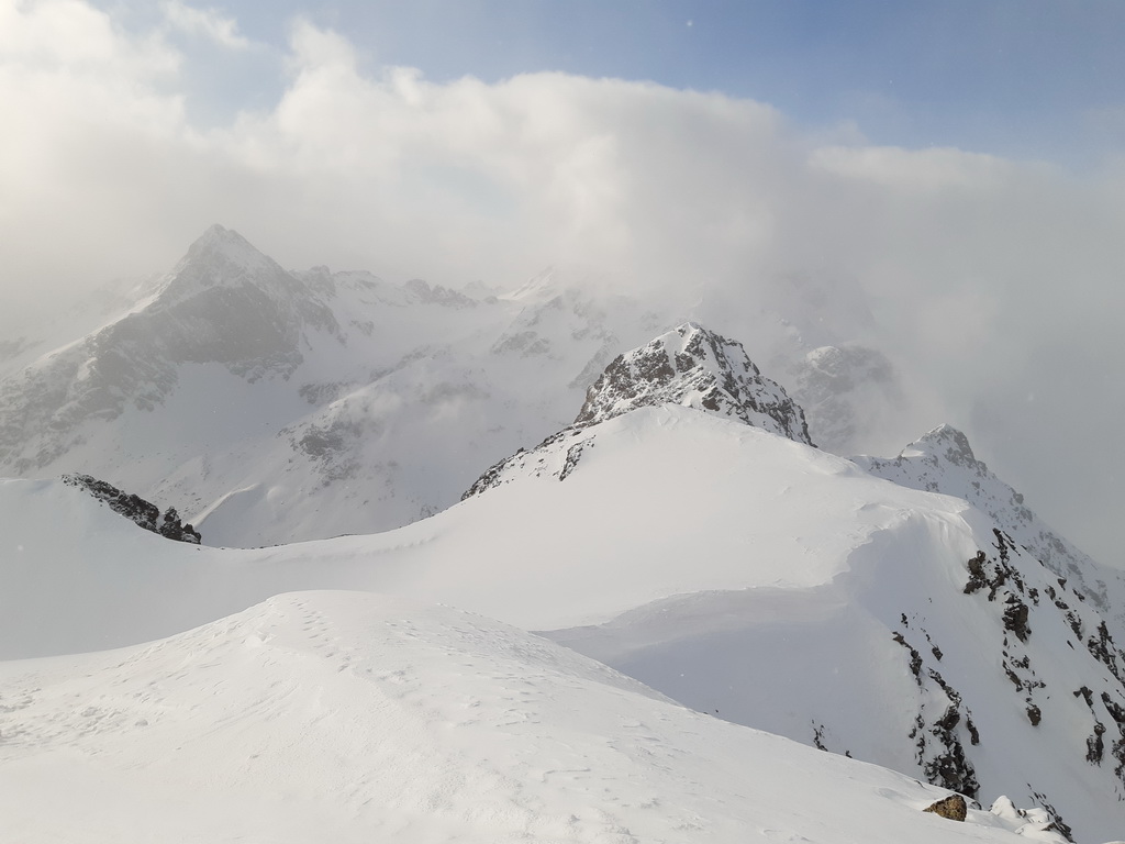 a poteším sa. Fičím v zjazde priamo k nej. Dnes prvá regulérna stopa, a ani vietor ju zatiaľ nezafúkal. Prešliapali ju nedávno. Lyže nechávam na polceste hrebeňom k vrcholu. Je to tu už zvyk. Vyfúkané, ale ináč taký krásny vrchol. Zbieham dole, nezlepujem ani pásy, kúsok s lyžami v rukách a potom už to ide zjazdovať aj na pásoch. V sedle plynule pokračujem ďalej na