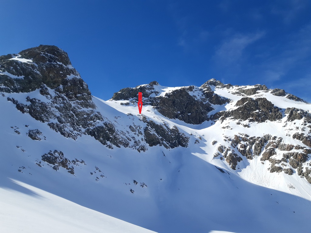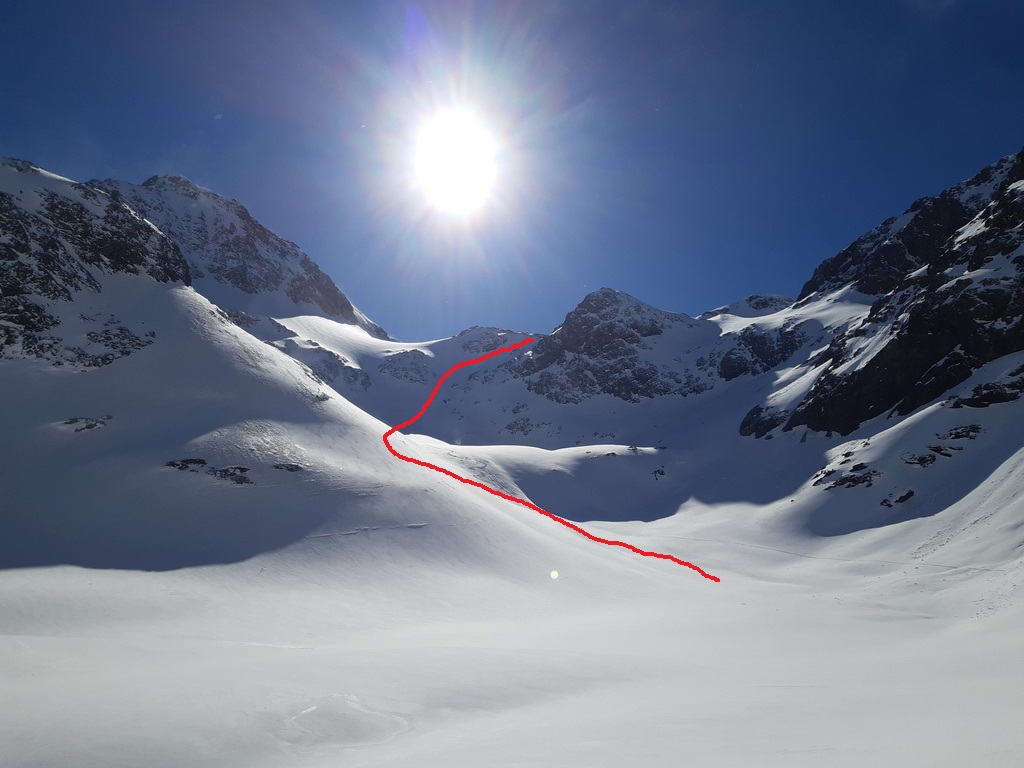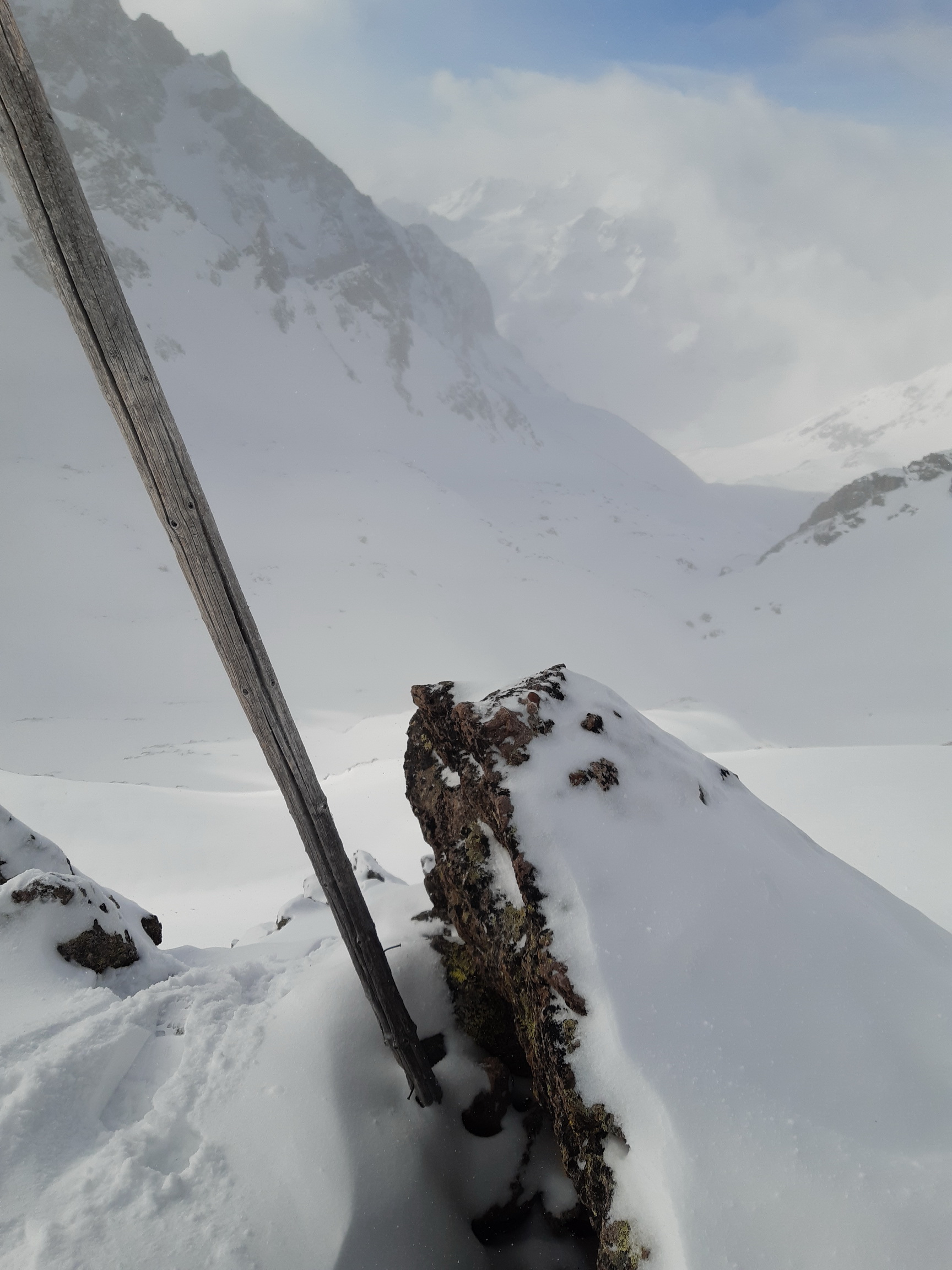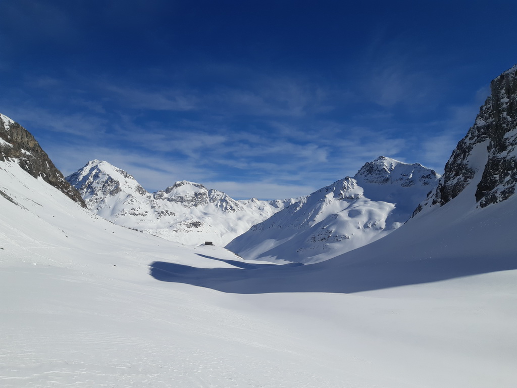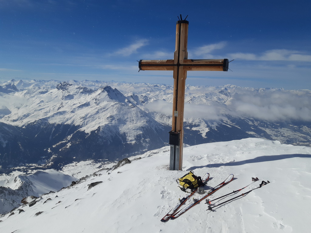 Žiadna stopa a snehu trošku viac. Vidím už zdiaľky. Ale kopec to je parádny a mal by som byť v závetrí. Dobré to je. Sneh ma moc nebrzdí... Iba trošku. Záver na haršajzne a vychádzam až hore ku krížu. Rozmýšľam, či tu bol pri mojich predošlých dvoch návštevách. Sa mi zdá, že nie. Dnes som tu sám a nikto už ani po mne nepríde. V hornej časti čerstvý sneh zakryl kamene, kua. Pri zjazde sa pokúsim o skratku. Nevydalo celkom jak som chcel a musím znovu nalepiť pásy (dnes trinásťkrát) a vyšliapať asi 50 v.m. Na druhý pokus sa to už podarí a lyžujem po zvyškoch ľadovca dole do doliny ku chate Jenatsch. Pred chatou odbočujem doprava, nalepím a šliapem prifúknutou stopou do sedla