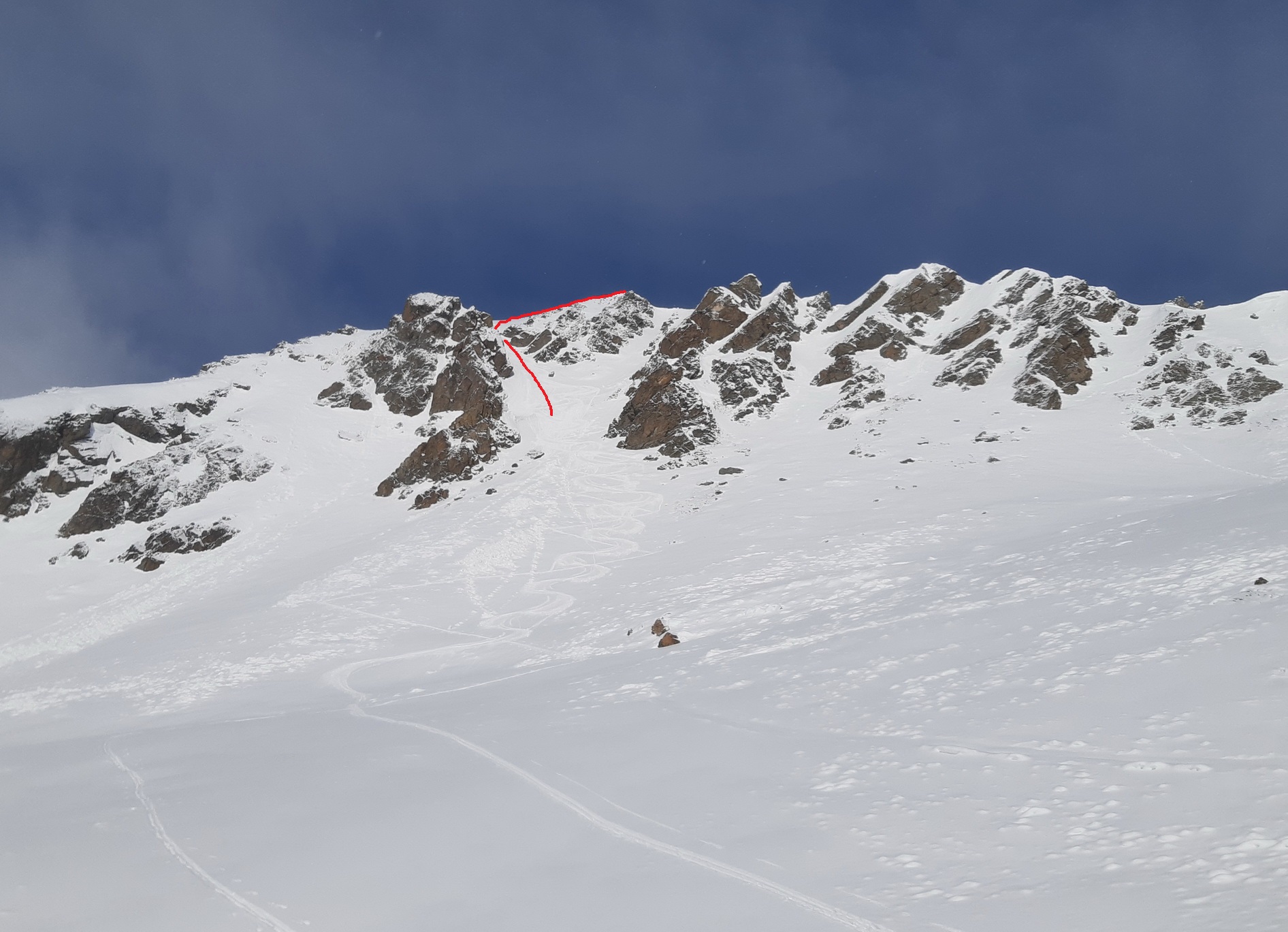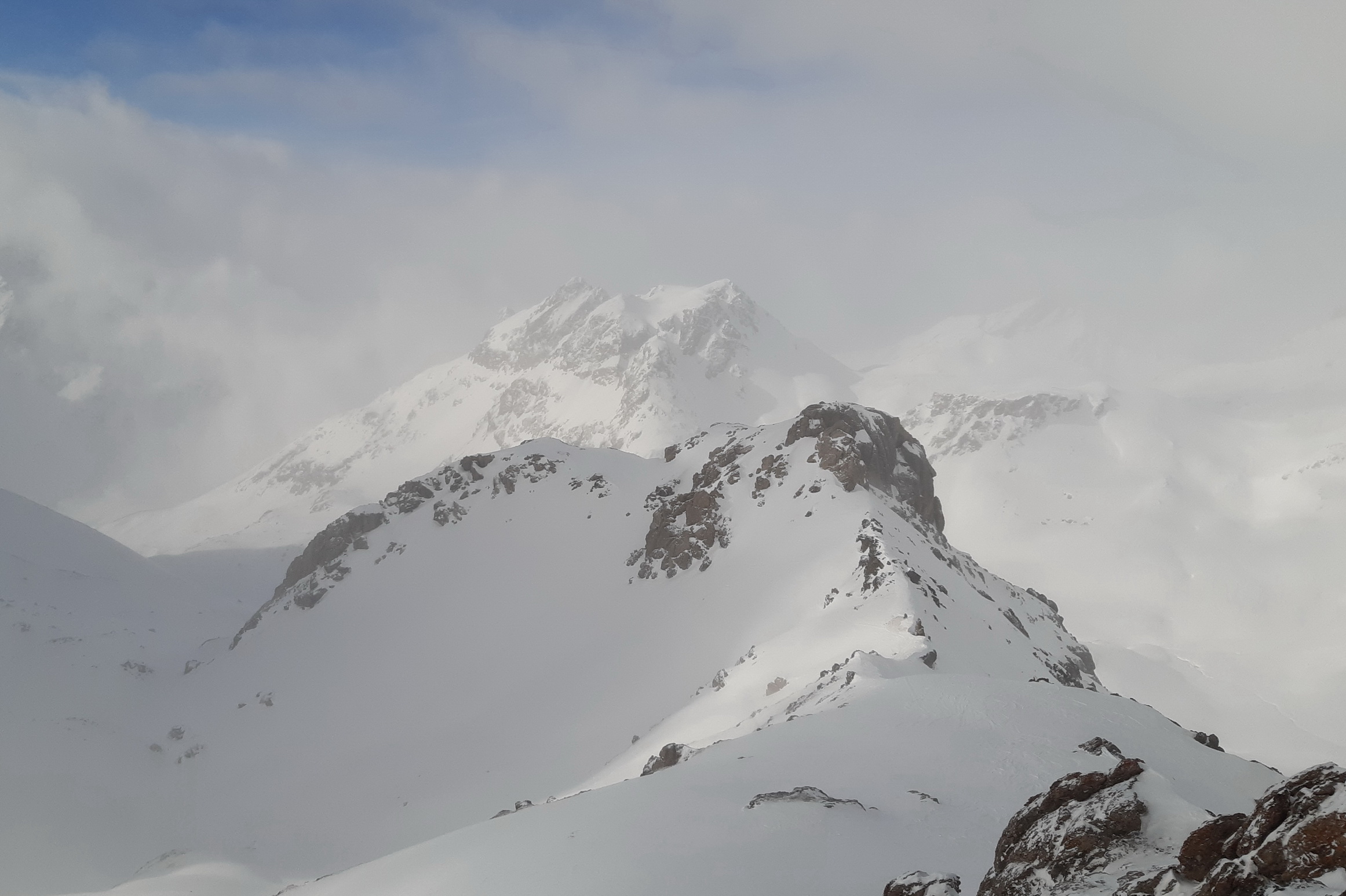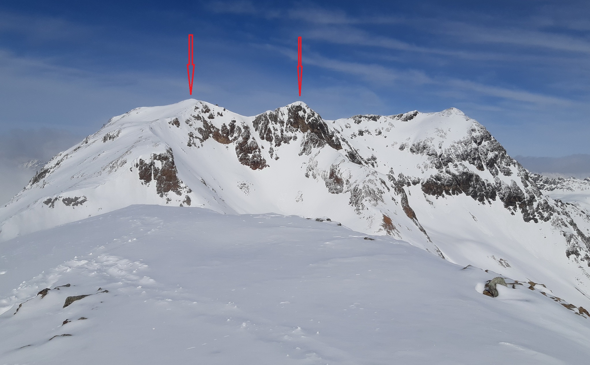Hore fúka, celkom dosť. Rozhodujem sa či ísť na druhý vrchol. Prepočítavam. Aj napriek vetru idem hore. Som tu na rane a na pešo musím vydupať asi 50 v.m. stupov do tvrdého snehu. Zakopávam, ide to aj bez mačiek. Na vrchole nespravím ani fotku, aj ked Calderas si o to pýta. Šak mám v archíve a fúka tu moc. Zjazdujem smer