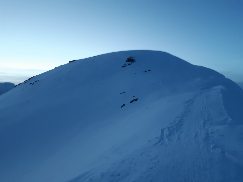 Čaká ma cca 900 v.m. Pekná bodka za dnešným dňom. Stopa dobrá, ale začína prituhovať. Rozmýšľam, či som dosť oblečený. Idem už naplno, nešetrím sa. Znovu sa ozýva zub, chladím ho vzduchom. V záverečnom výšvihu prekvapí dobrá stopa. Dnes asi tretí kopec, kde som ju nešliapal. Idem neskoro. Slnko už zašlo. Spravím dve fotky. Na vrchole sa len pár sekúnd porozhliadnem. Je to naša obľúbená túra so Slávkou. Chodíme sem každú zimu.