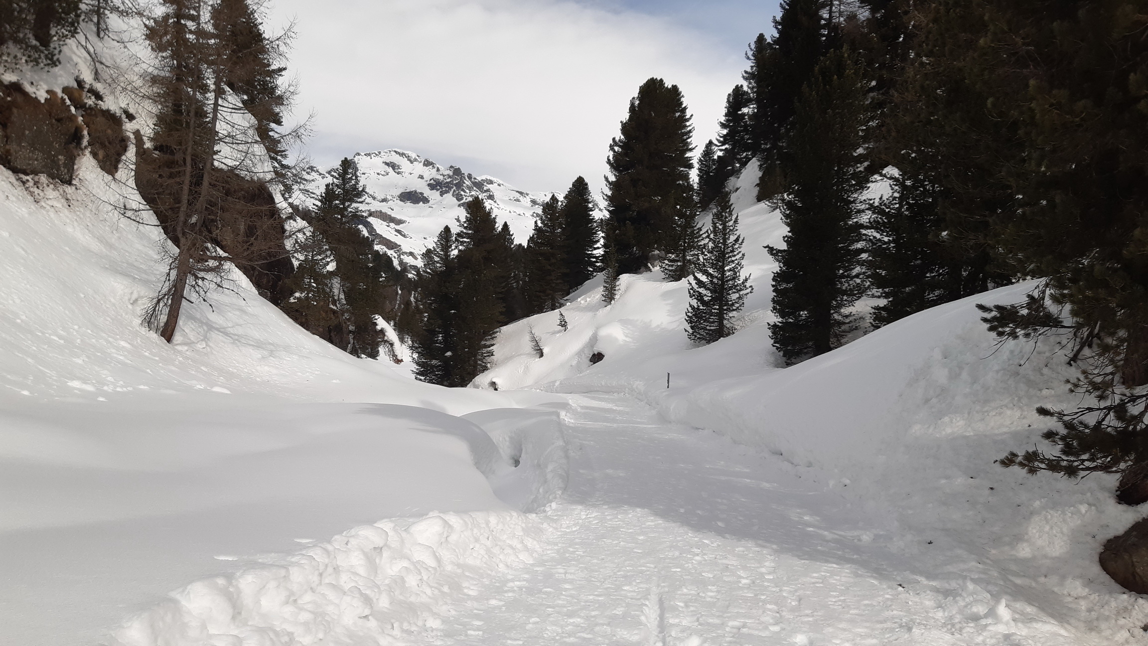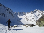 Trošku sa javí problém stopa... pri výstupe popri lyžiarskych stopách, ktoré tu nechala skupinka skialpinistov totiž nenachádzam stopu výstupovú a tak ma napredovanie stojí viac síl ako by som chcel. Partia totiž vystupovala hore inou trasou. Na ich výstupovú stopu koečne narazím až na ľadovci a to som už kúsok pod finálnou časťou výstupu.