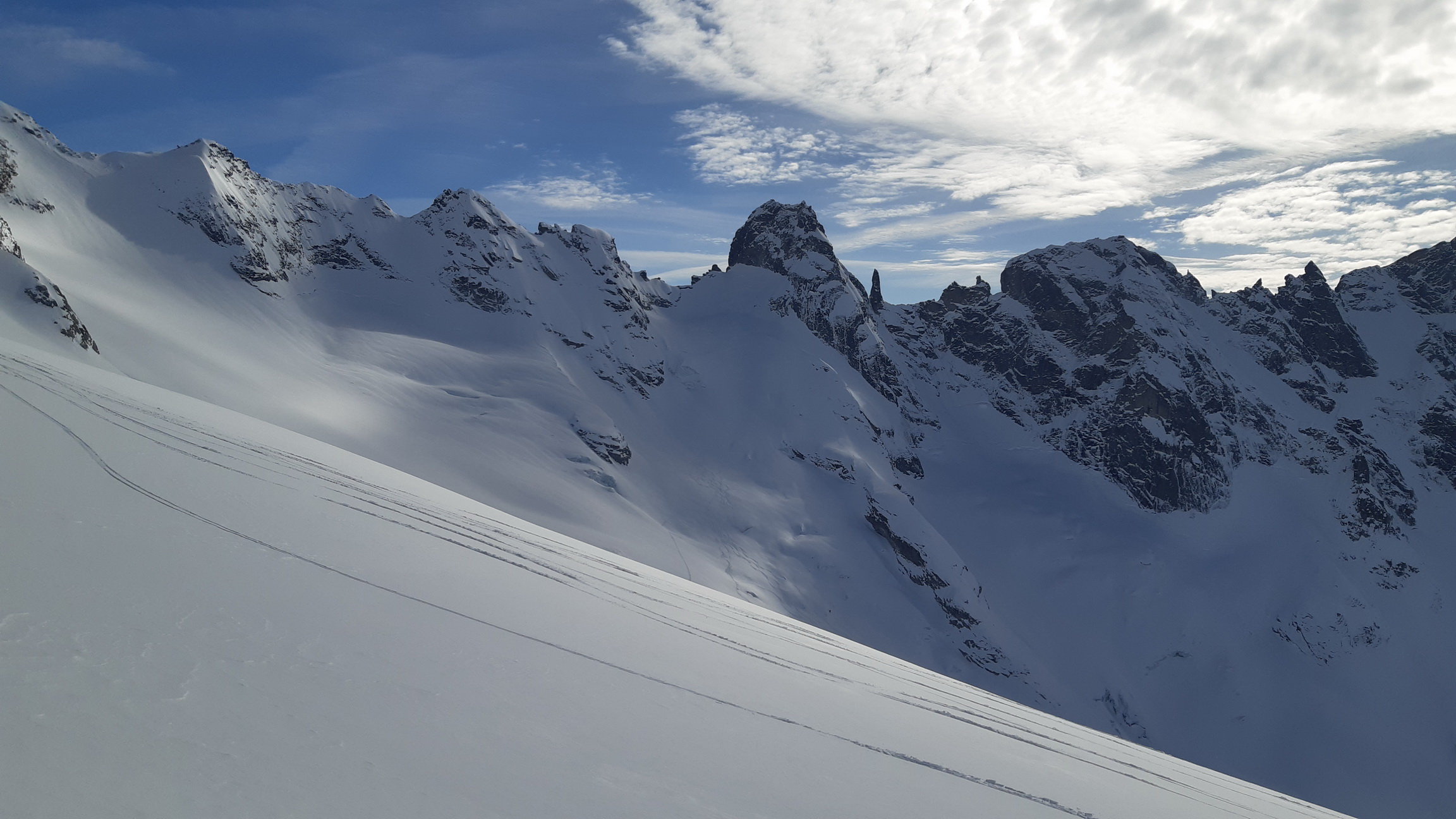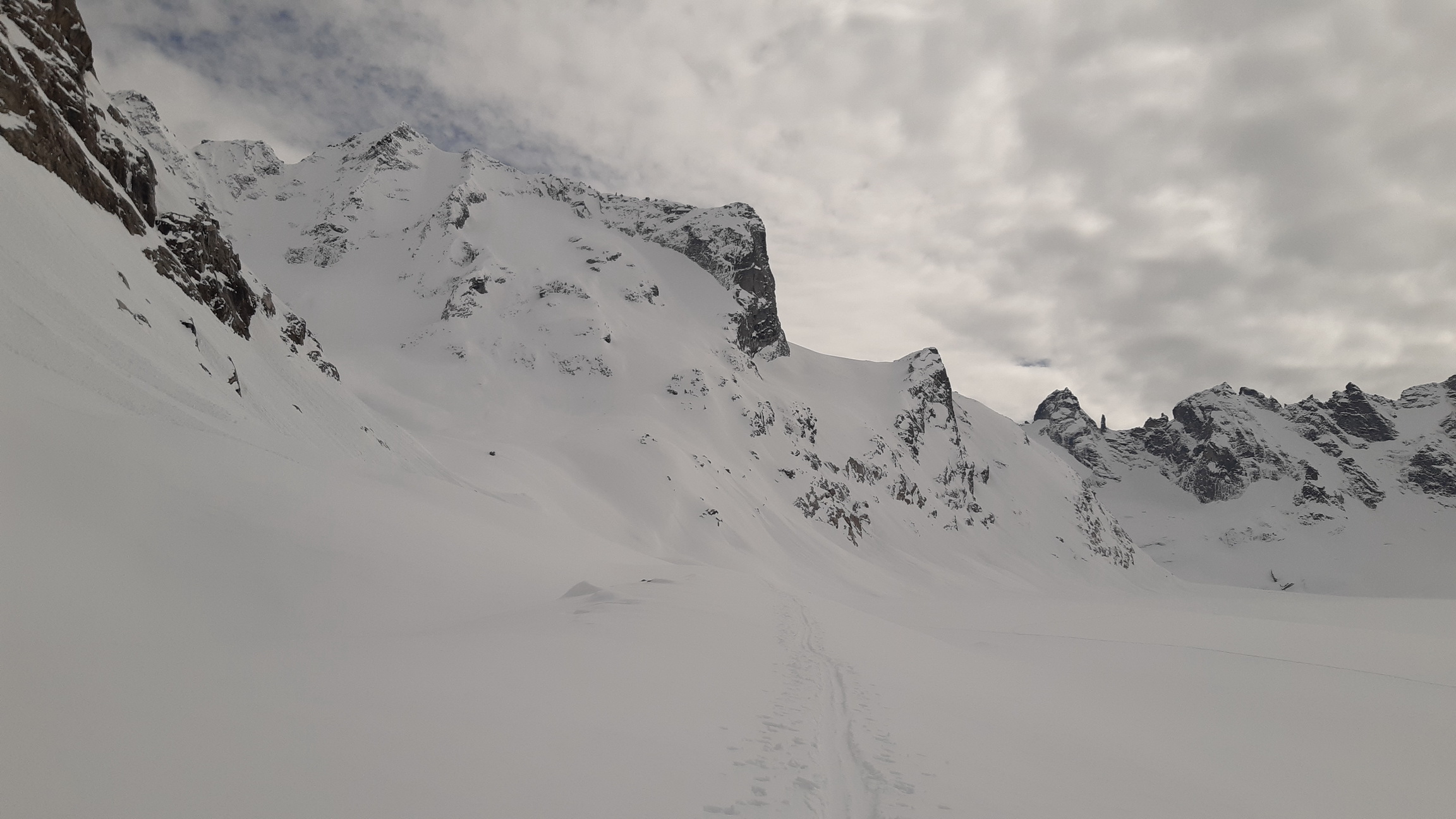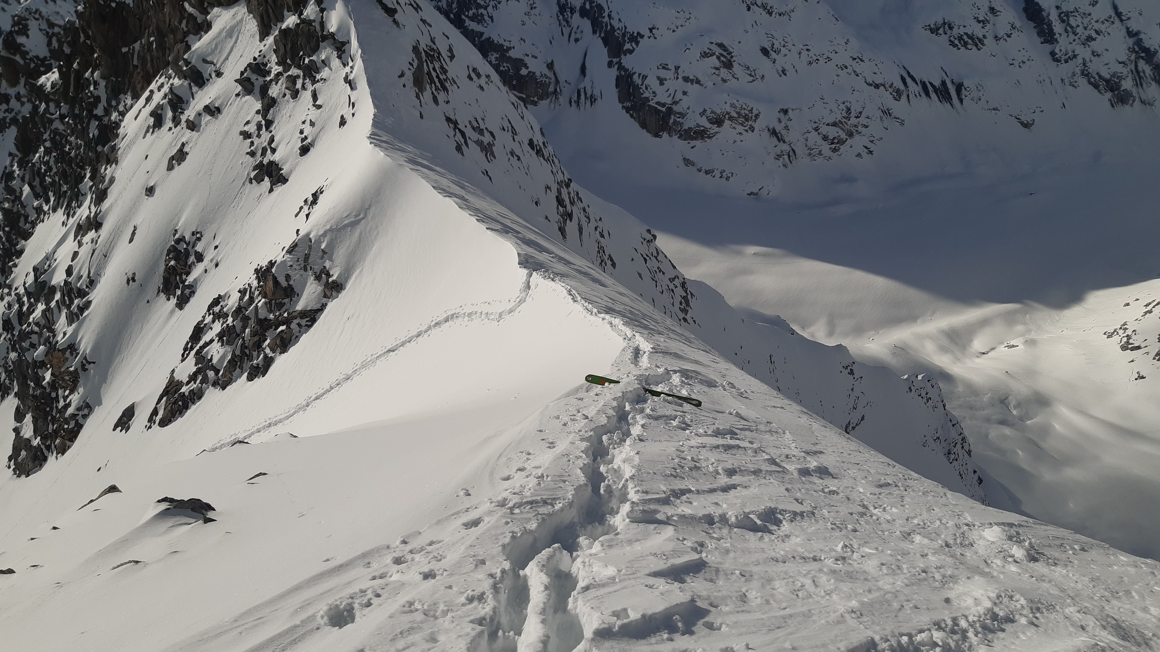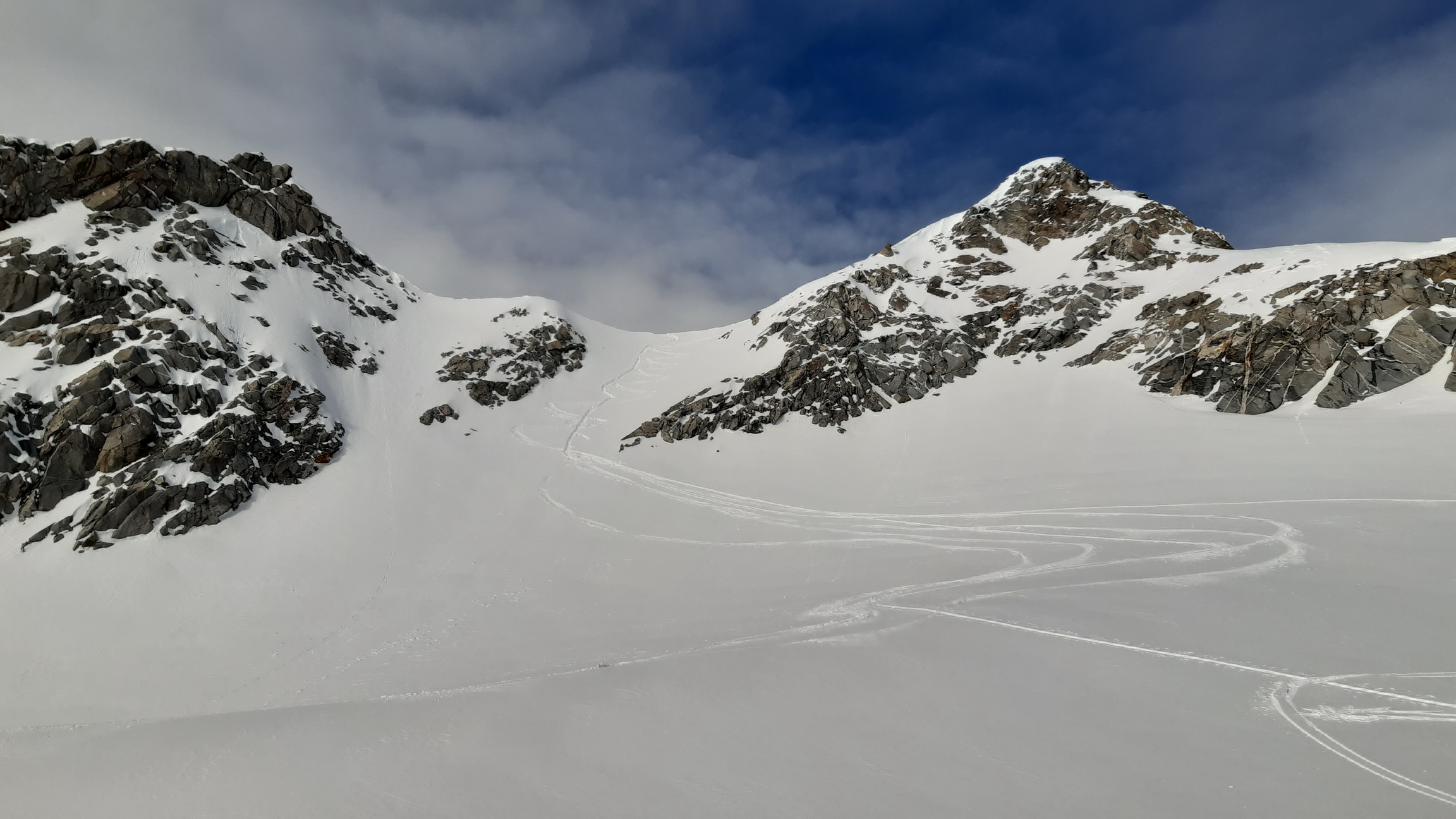 Vyrážam z chaty. Najprv zjad na ľadovec, nalepím pásy a potom šlapem smerom do doliny medzi dva štíty Monte Rosso a jeho väčšieho brata Cimu di Rosso. Vtom zbadám ľudí lyžujúcich spoza Cima di Rosso, mieria popri mne dole a je mi jasné, že v týchto podmienkach boli na vrchole. Rozhodujem sa rýchlo, skúsim to, stopa bude a to je hlavné!