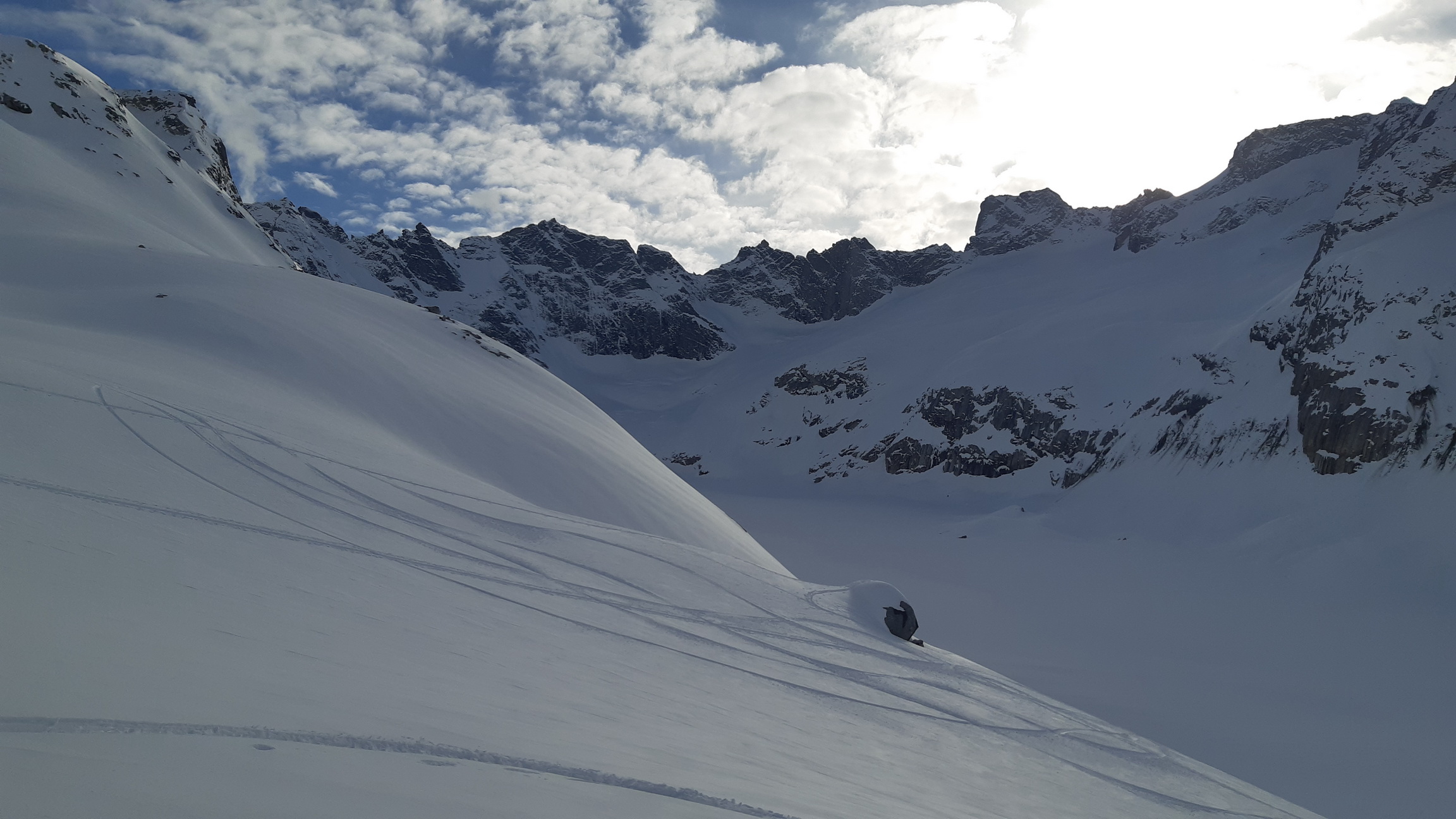 Ešte ma čaká depo so zobutím mačiek, obúvam lyže, super sneh v strmom žlabe zo sedielka, pod ním pár fotiek a fičím dole. Je veľkou výhodou oproti Tatrám, že tu je večer takmer o hodinu dlhšie svetlo.