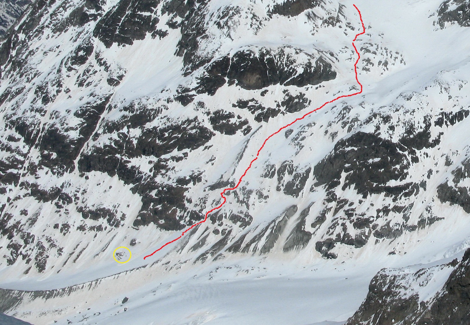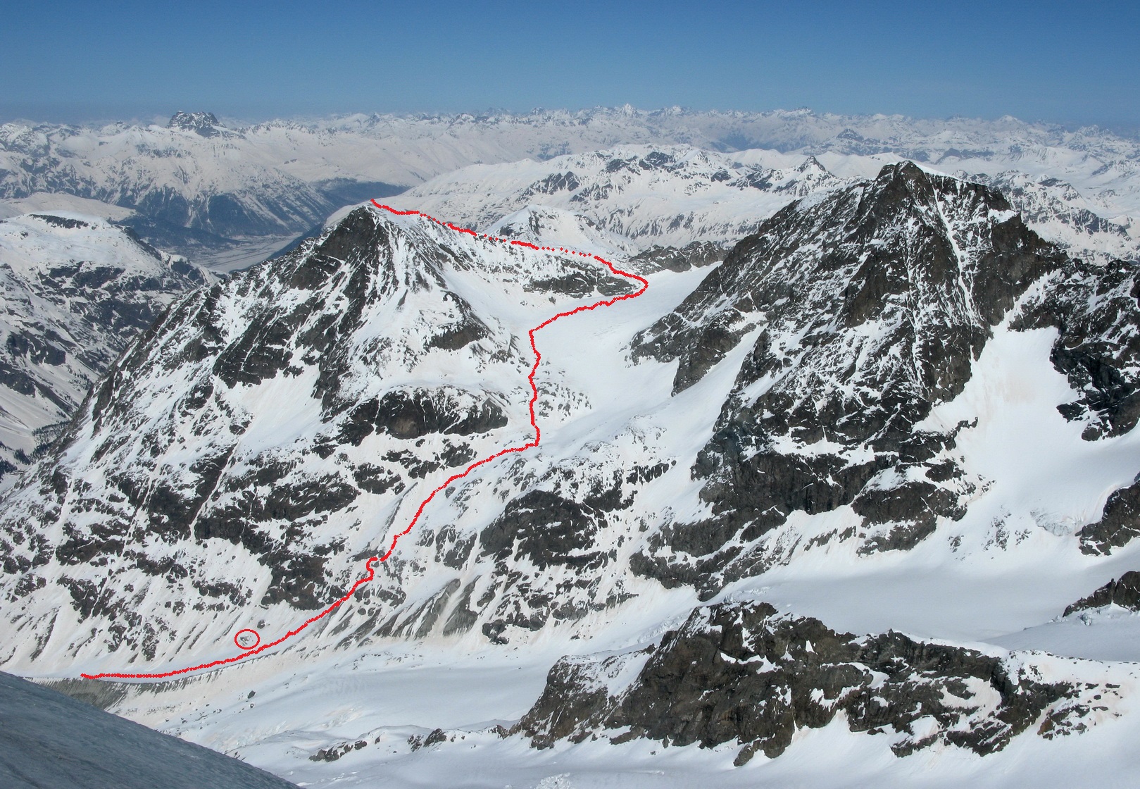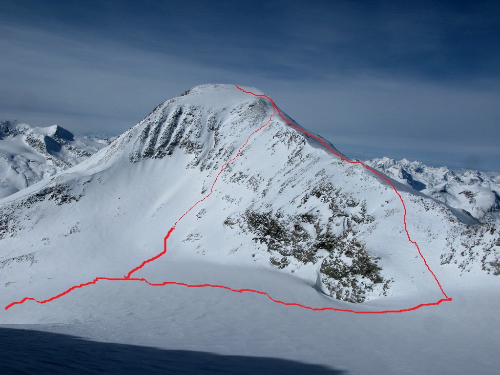 Vzhľadom na neisté podmienky na ľadovci, ktorým som chcel pokračovať a aj na únavu zo zimy som sa na vrchole rozhodol zlyžovať naspäť dole po výstupovej trase. V hoteli som bol po 5 hodinách akcie...
