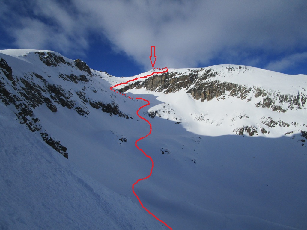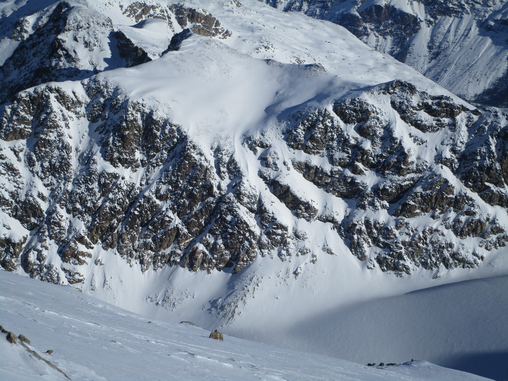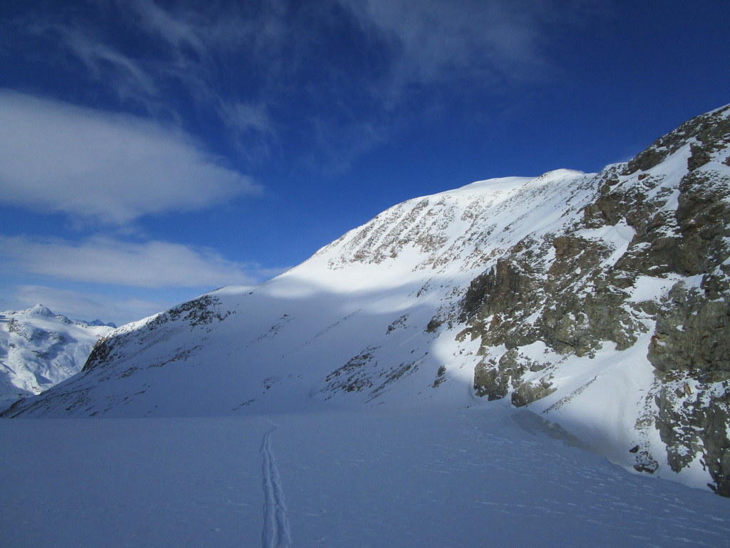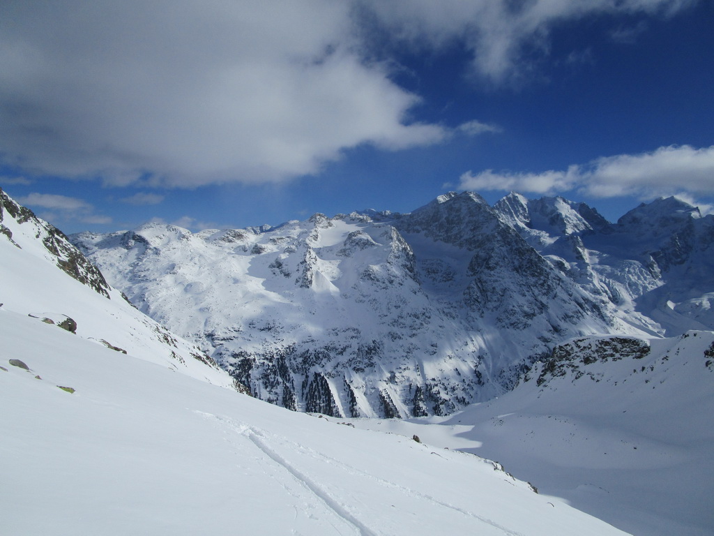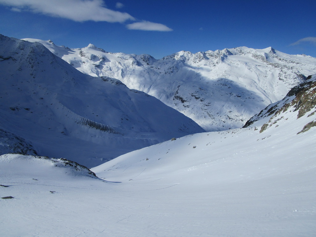 Odtiaľto už šlapem stopu príjemnými svahmi až ku ľadovcu. Pozorujem, že trhlinky sú prikryté. Vďaka častým letným výletom viem, že by to malo byť ok. Prichádzam ku miestu kde sa treba strmým svahom dostať na hrebeň vedúci až na vrchol Tschiervy. Snehu je pomenej ale je tvrdý a tak znovu pomocou haršajzní sa mi to darí na lyžiach.