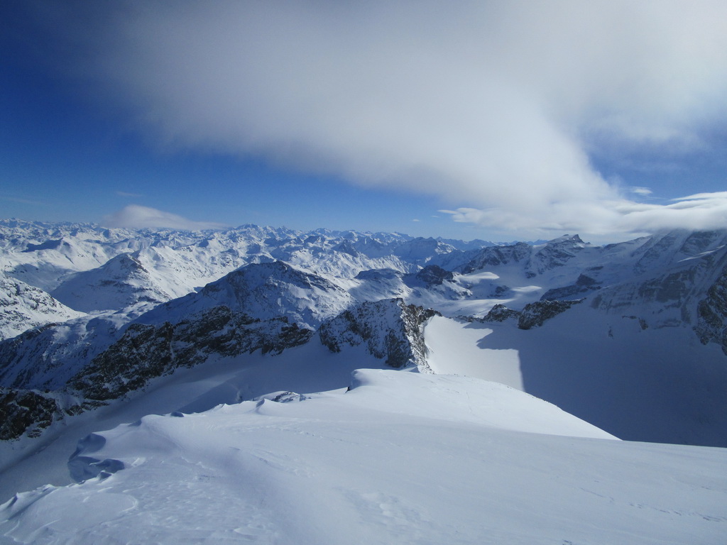 Odtiaľto už postupujem po pravej strane hrebeňa s lyžami až na vrchol. Piz Tschierva pri pohľade od Fuorcly Surlej veru nevyzerá, že by sa tu dalo dostať až hore na lyžiach, opak je ale pravdou. Je to pekná a na výhľady vďačná túra.