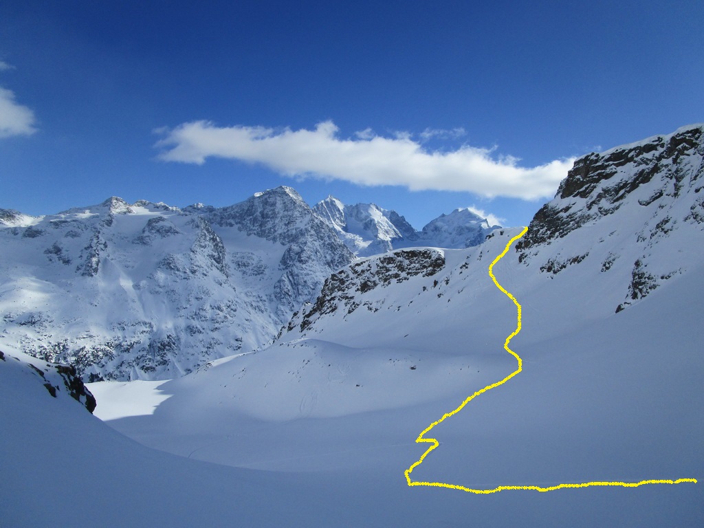 Trasa vedie najprv po bežeckej stope ktorá je konečne po dvoch rokoch znovu upravená v plnom rozsahu. Z nej po asi 20 minútach odbočujem ku moréne ľadovca a popri nej šlapem ku chate Tschierva. Od chaty už snehu ubudne a miestami je ho len tak aby to stačilo na postup. S pomocou haršajzní zdolávam prvé strmé miesto bez toho aby som dával lyže dole. Haršajzne si nechávam a pomocou nich prekonávam aj druhé miesto. Strmý traverz je na mieste kde je základ určite ľadový, prechádza totiž nad potokom.