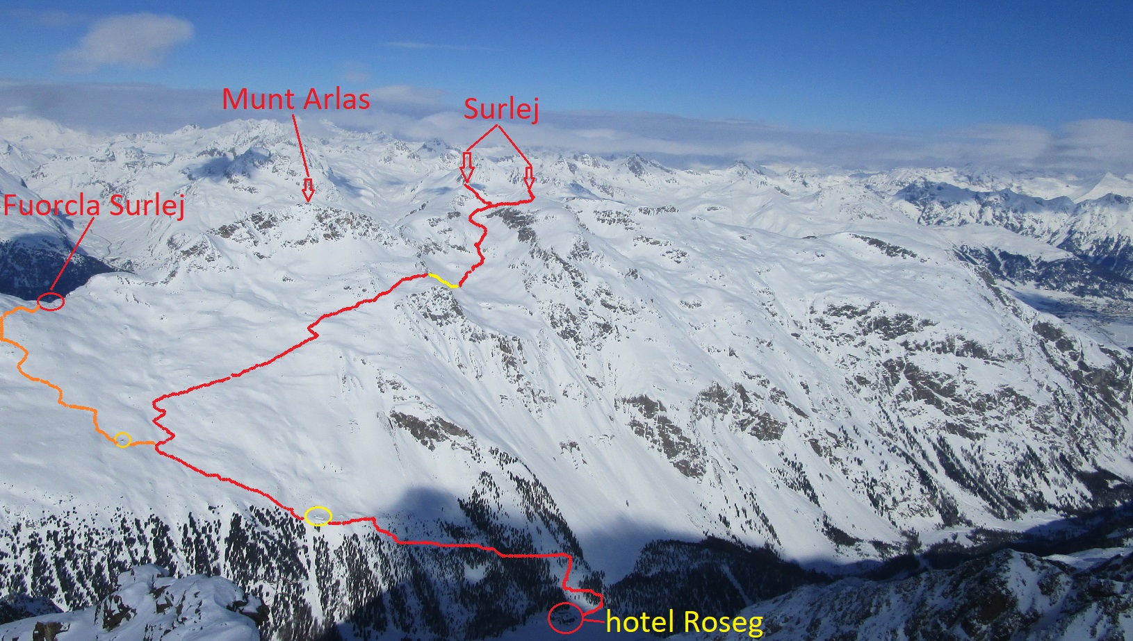 Po dvoch veľmi slabých zimách je konečne od začiatku tejto zimy slušný základ a dajú sa podnikať kvalitné túry v celom Engadine. Trochu škoda toho silného vetra, ktorý v oblasti vrcholov a hrebeňov odfúkol veľkú časť snehu preč...