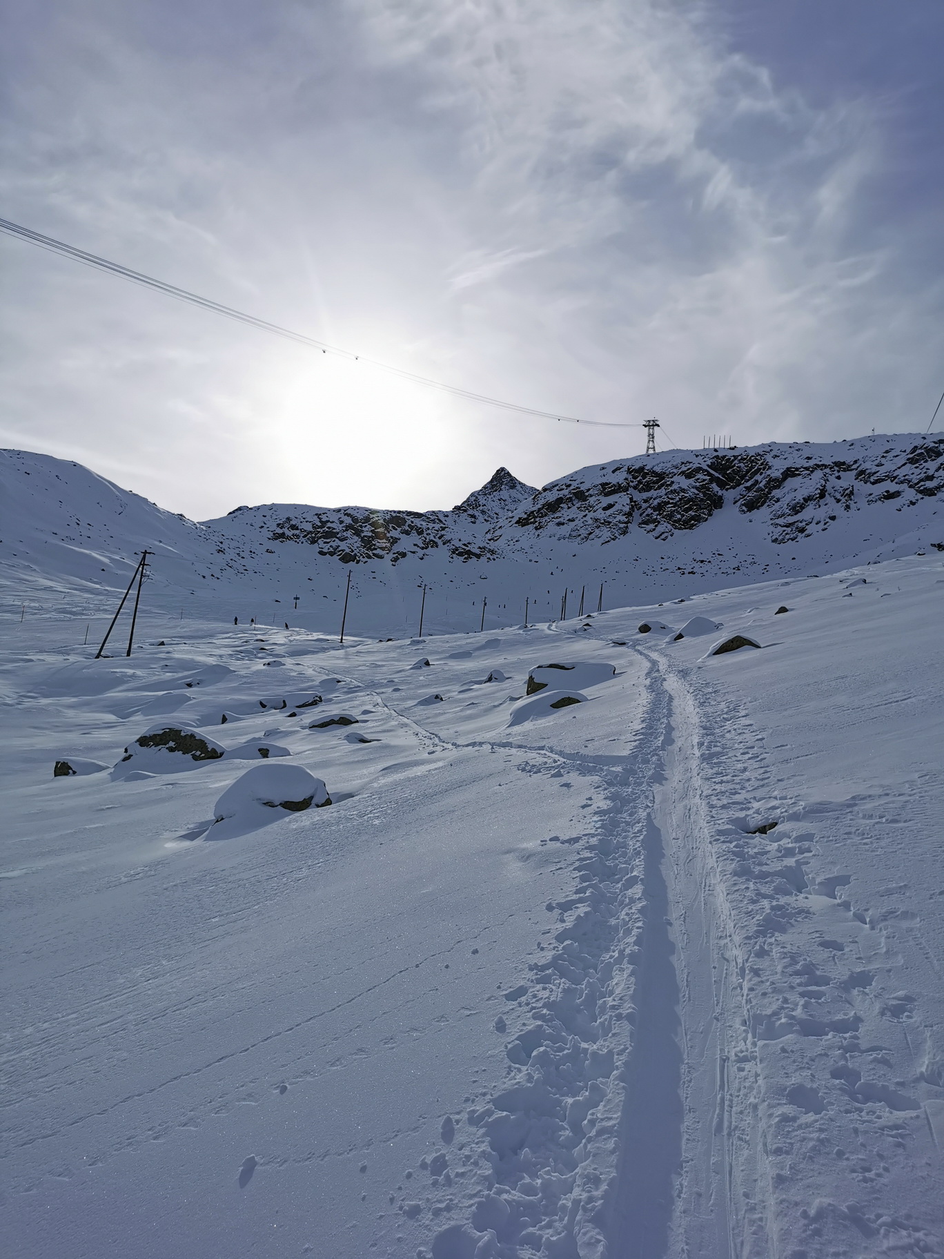 Prvú príležitosť vyraziť niekde šlapať som vzhľadom na snehovú situáciu využil na Diavolezze. Začiatkom zimy ak nie sú vo voľnom teréne vhodné podmienky tu býva príležitosť vyšlapať popri zjazdovke a zlyžovať dole po nej.