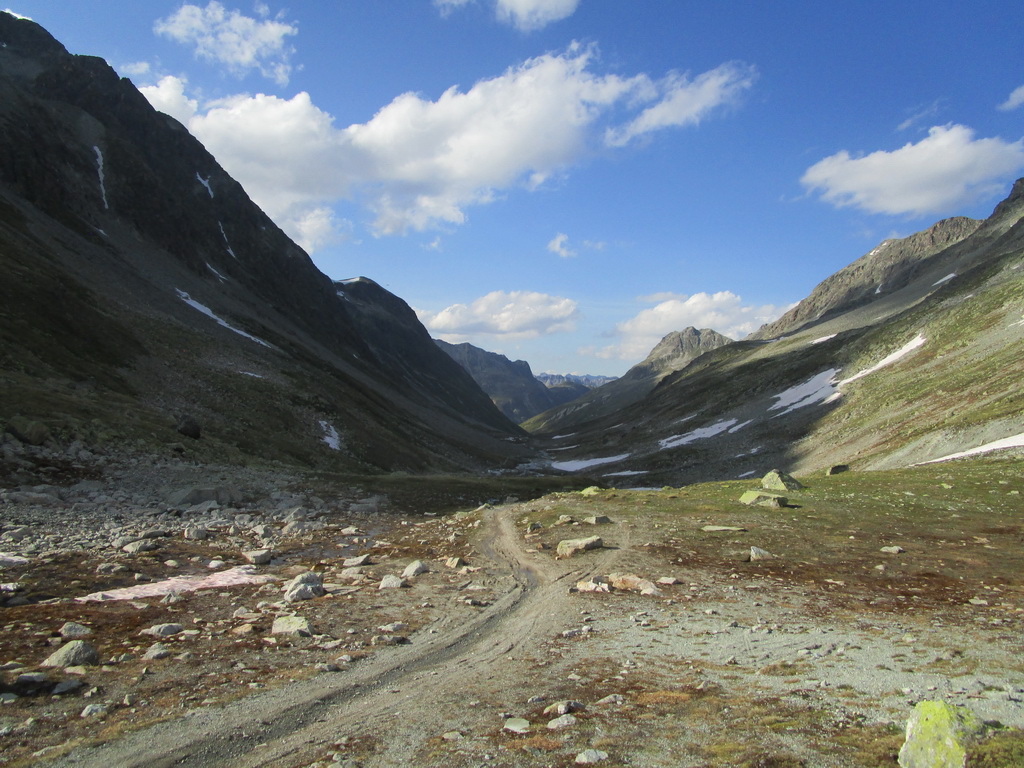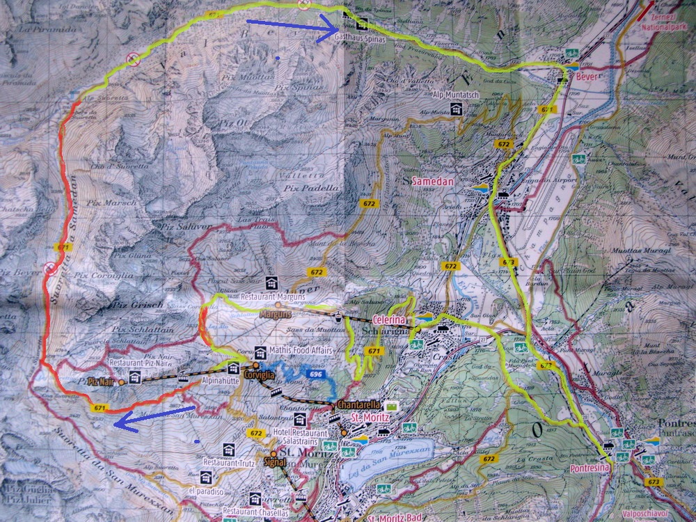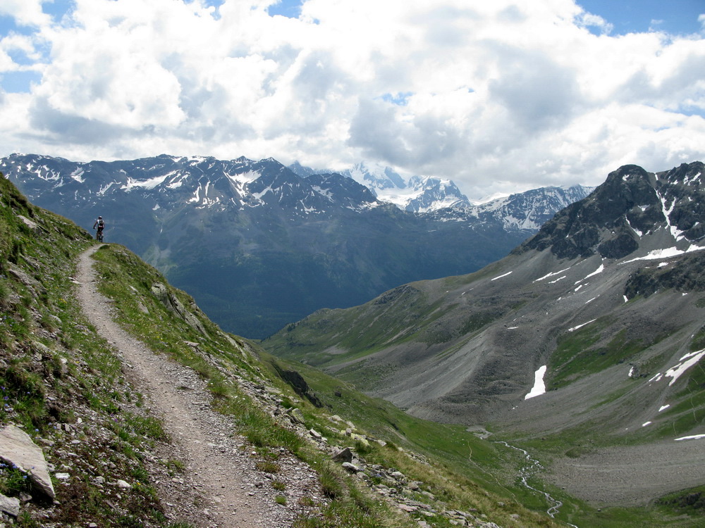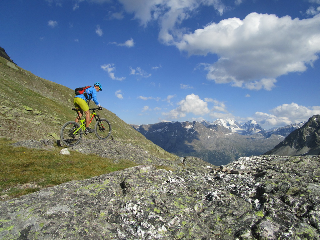 Mal som už nejaké informácie, podrobnú mapku singlov k tomu (je k dostaniu zdarma), a tak som si naplánoval a uskutočnil okruh cez Celerinu, serpentínami cez lyžiarske stredisko až k passo Suvretta. Zaujímavosťou bol už krásny traverz a zjazd do sedla. Tu sa už bajker dostáva pomaly mimo civilizáciu a umožní mu to práve krásny singlík, vytesaný miestami aj v žulovom suťovisku.