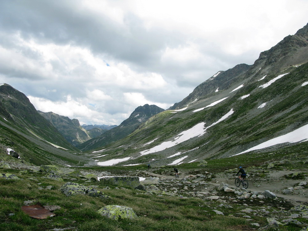 Zo sedla Suvretta už nasledujú orgie dole do doliny Val Bever. Tu som už moc nefotil, ale... Jazdil. Zjazd je to určite ťažký, párkrát som aj musel nohu na zem dať. Dokonca aj zo dva razy bajk asi dva metre preniesť. MTB v tejto podobe je ťažký šport, tam kde ešte niekto vychutnáva, iný už sa trápi s bajkom na pleci...