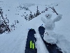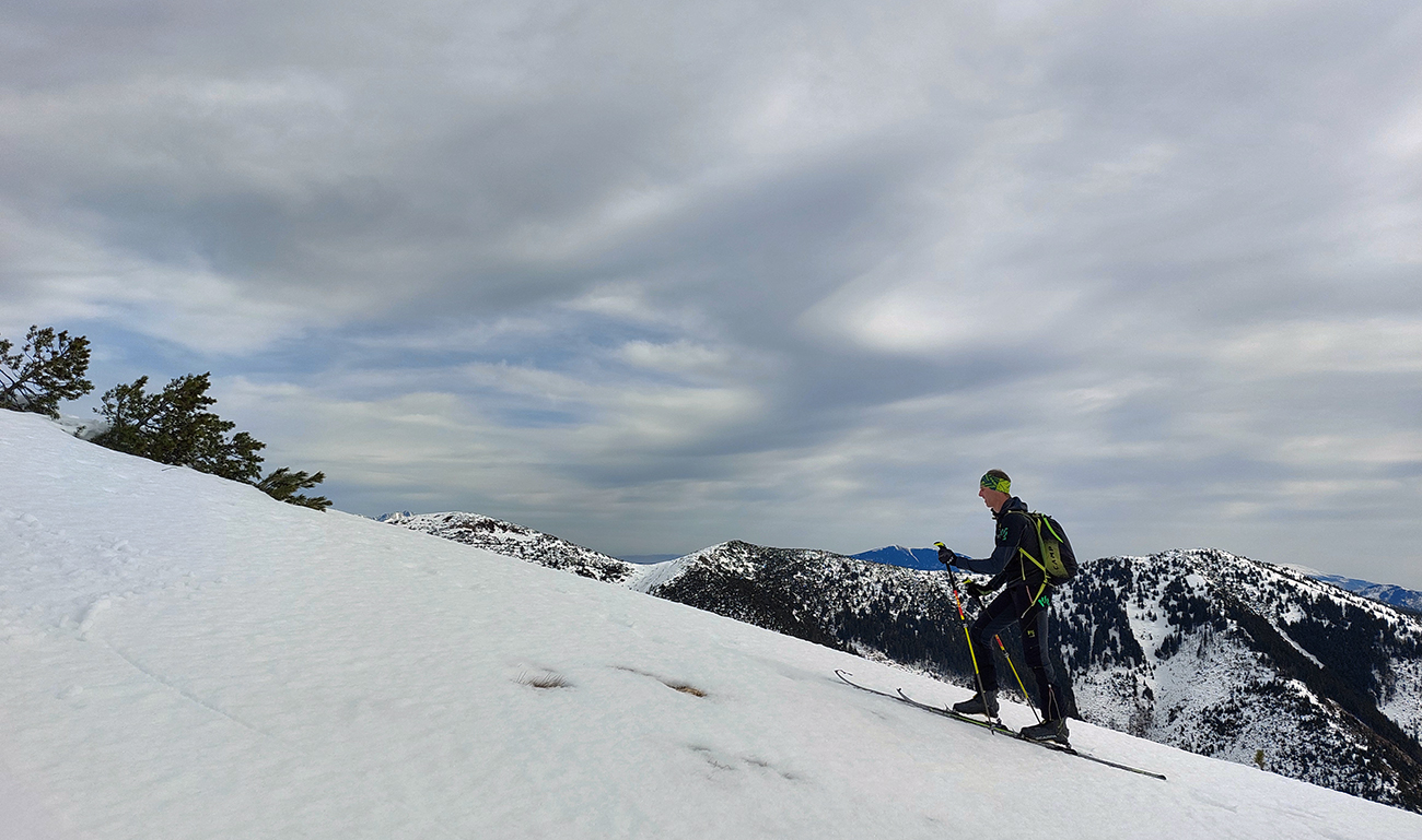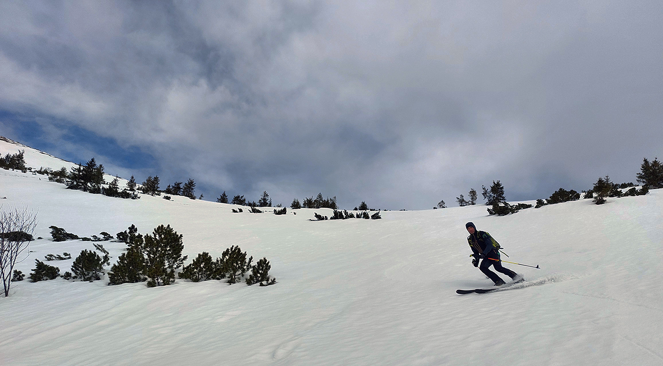 Zároveň sa ale otvárajú výhľady a počasie hovorí, že „východný centrál“ Besnej si asi necháme na koniec, tam teraz ešte zima bude, a teda hrkotavo. Ako prvý skúsime hrebienok z vrcholu na juhovýchod. A opláca sa! Hore trochu prituhnutý, nižšie už odmäknutý firn, ale rovný, také oblúky sa dajú rezať, že až!