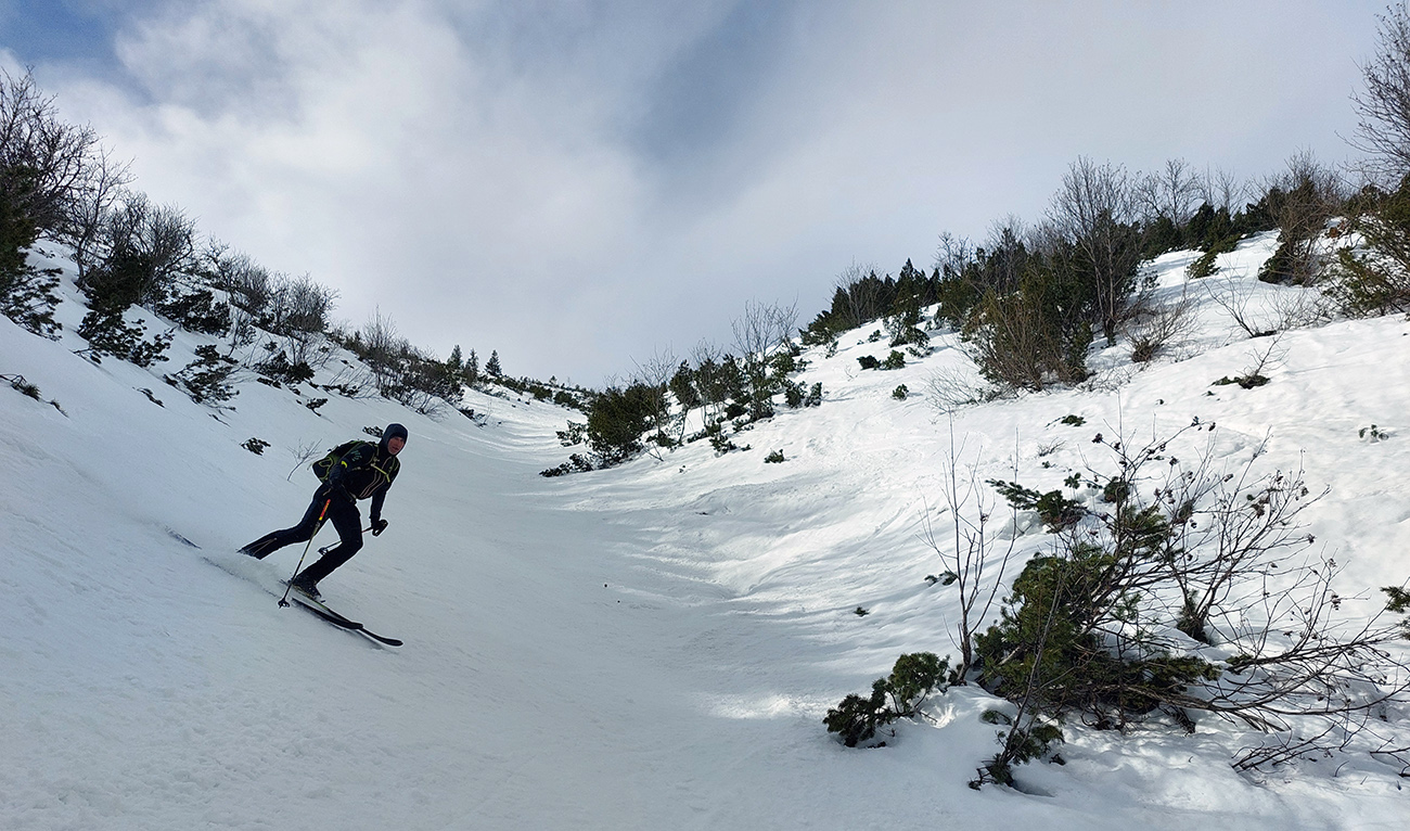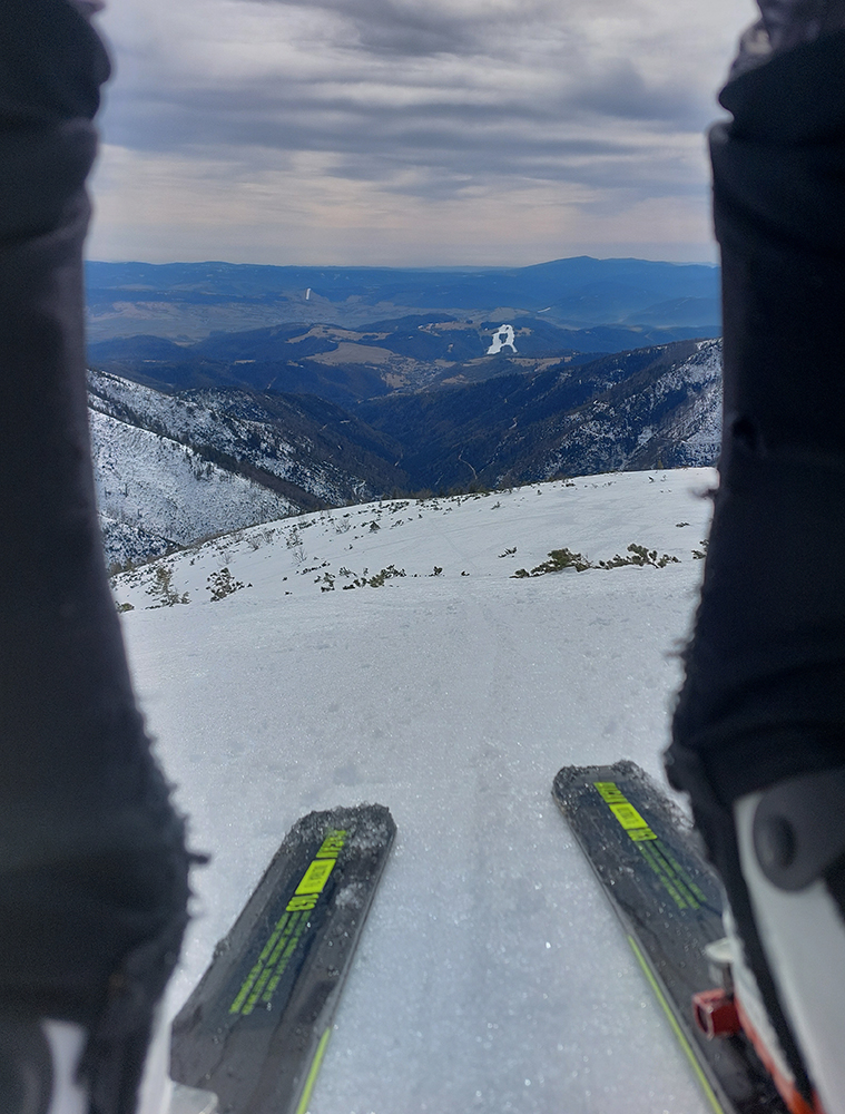 Lebo namiesto návratu traverzom to púšťame do Bocianskeho sedla rovno dole z hrebeňa. Po suchom a tvrdom, krátkymi oblúkmi pomedzi ledva zasnežené vrcholce kosovky. Voľnejšia oblúkovačka z Bocianskeho sedla dole lúkami k lesíku je potom zas o niečom úplne inom, to je pravá jarná firnovačka. Na parádu.