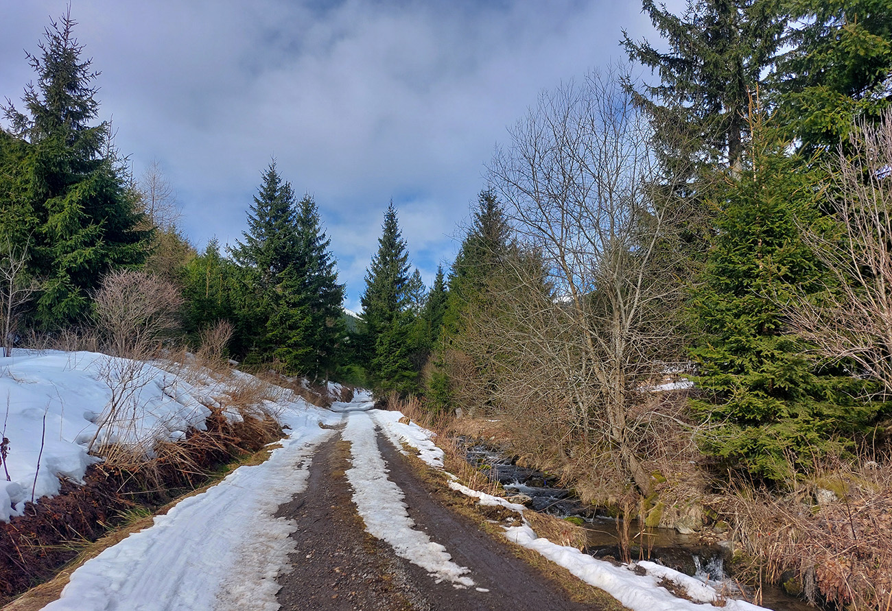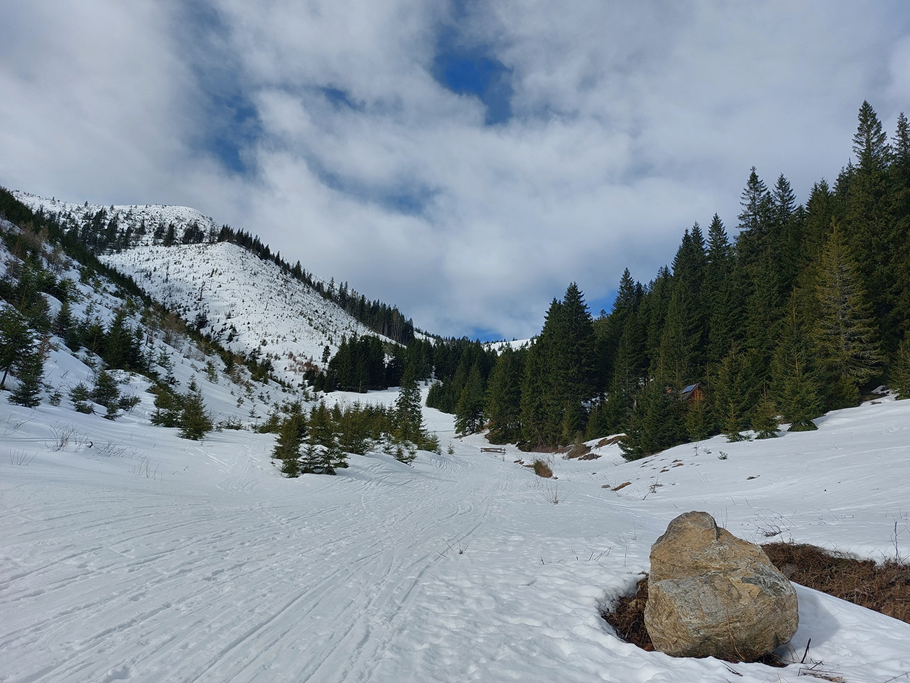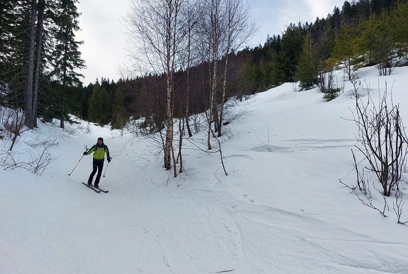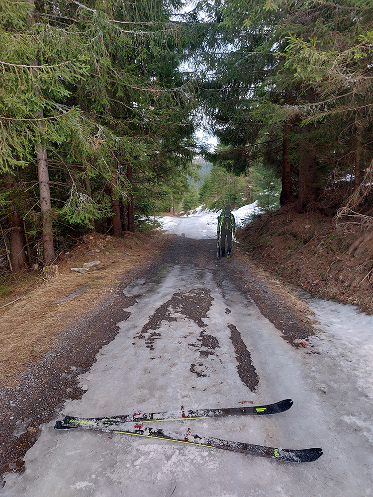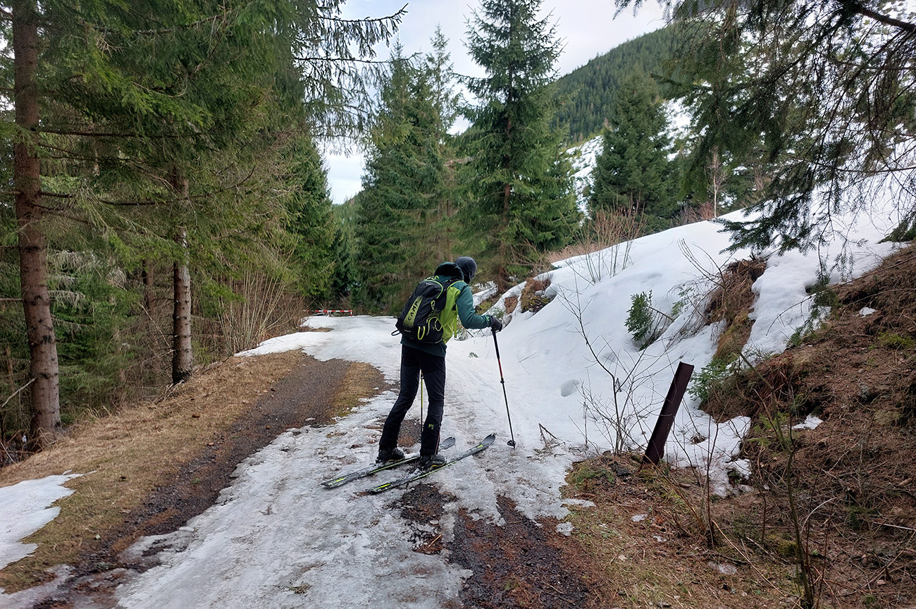 Takže dno doliny – tam sa ešte dlho bude dať. Hrubá vrstva udupaného snehoľadu, len v dolnej časti na pár miestach pod stromami bez snehu. V lesíku hojdavé, vyšmýkané mnohovariantné chodníčky, ráno trochu ľadové, popoludní smerom dole hravé.