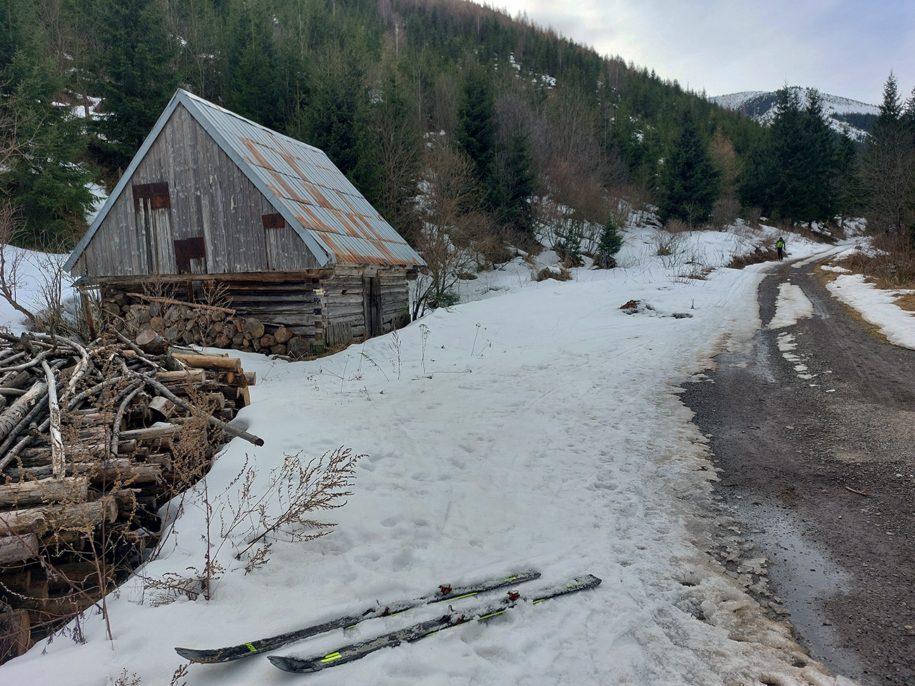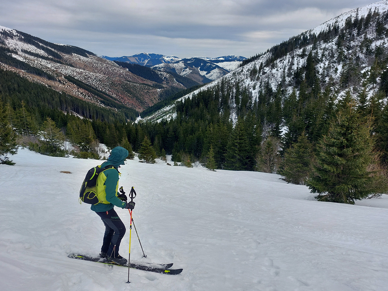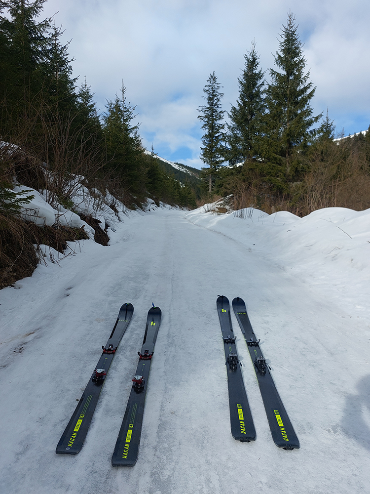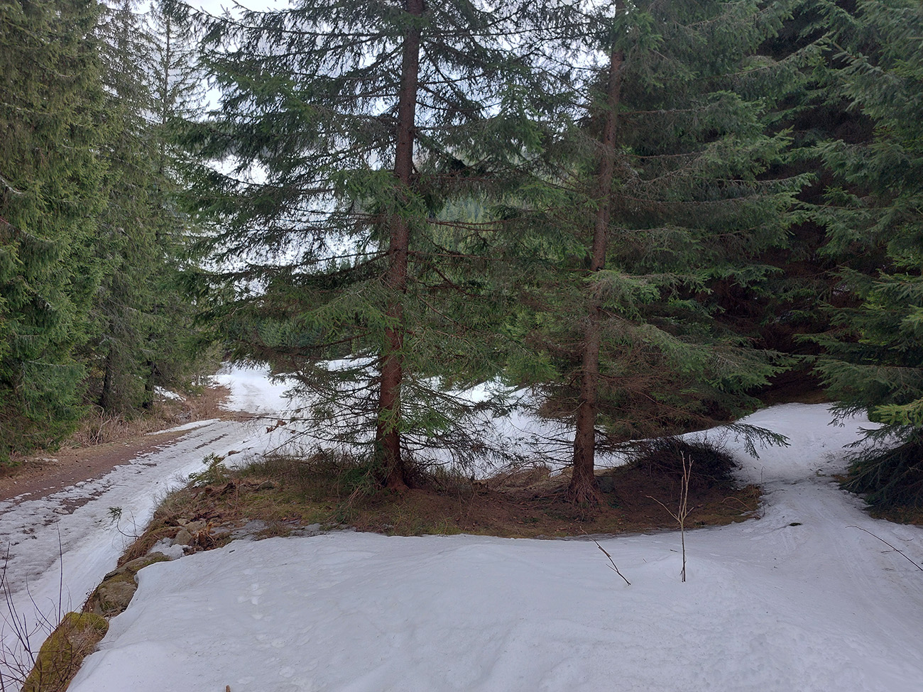 Takže dno doliny – tam sa ešte dlho bude dať. Hrubá vrstva udupaného snehoľadu, len v dolnej časti na pár miestach pod stromami bez snehu. V lesíku hojdavé, vyšmýkané mnohovariantné chodníčky, ráno trochu ľadové, popoludní smerom dole hravé.