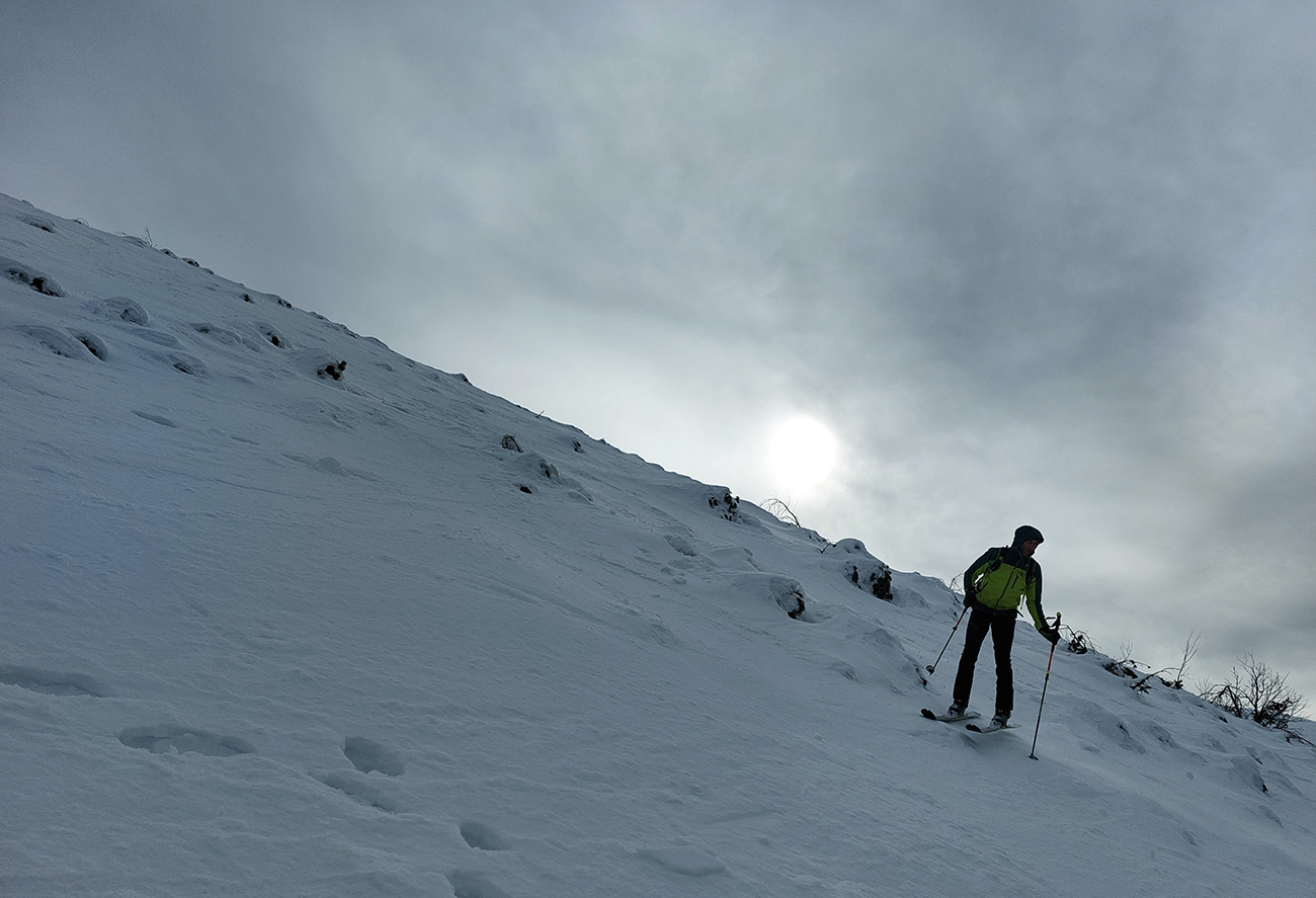 Na hrebeni voľba jasná – stúpame ďalej, na Besnú (1807 m). Lebo vraj je chuť lyžovať a zhora sa uvidí, čo by sa dalo. Lebo je pod mrakom a teda pod nulou, sobotné čisté nebo sa nekoná, pod lyžami to dosť hrkoce. Stúpame miestami už len po zvyškoch, okolo Panskej hole to už dlho v tom južnom traverze nevydrží.