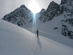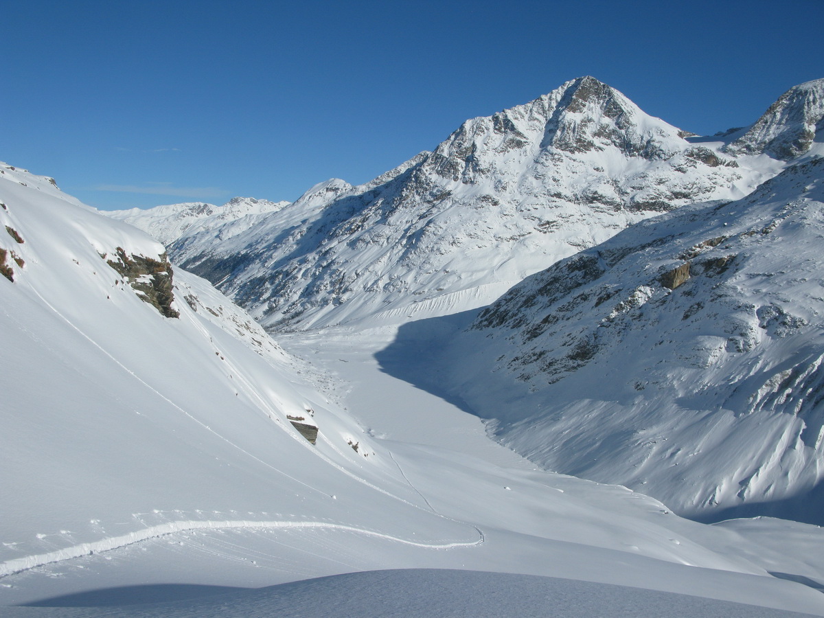 Val Forno... Áno, aj táto fornomenálna dolina patrí do Engadinu, a tak vo výbere nemôže chýbať kopec z nej. Je to oblasť, na ktorú sa snažím vytrvalo upozorňovať. Skialpových cieľov tej najvyššej kategórie sa tu nájde nemálo. Úžasné na spomínanej túre na vysoký a dominantný Cima di Rosso je to, že normálkou sa na ňu v zime dostanete pomerne jednoducho, len v závere treba trošku popoliezť. Pri výhľadoch na všetky strany vám ale môže zamrznúť úsmev na tvári. Val Forno je jedna z najkrajších a najdivokejších dolín vôbec. Alternatíva je napríklad Monte Rosso a pre milovníkov strmých extrémnych zjazdov bude veľkou lahôdkou severná stena. Východiskom na túry z doliny je parádna chata Forno (množstvo informácií si preklikáce cez článok o tomto výstupe dole).