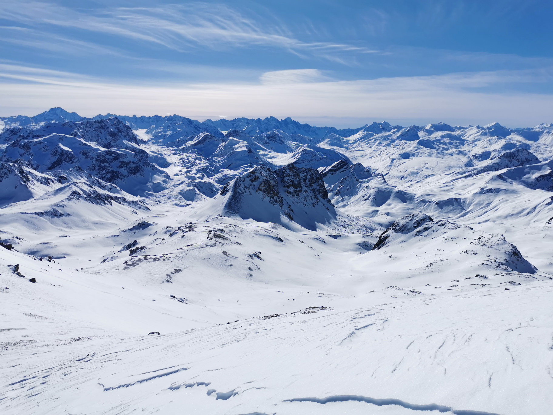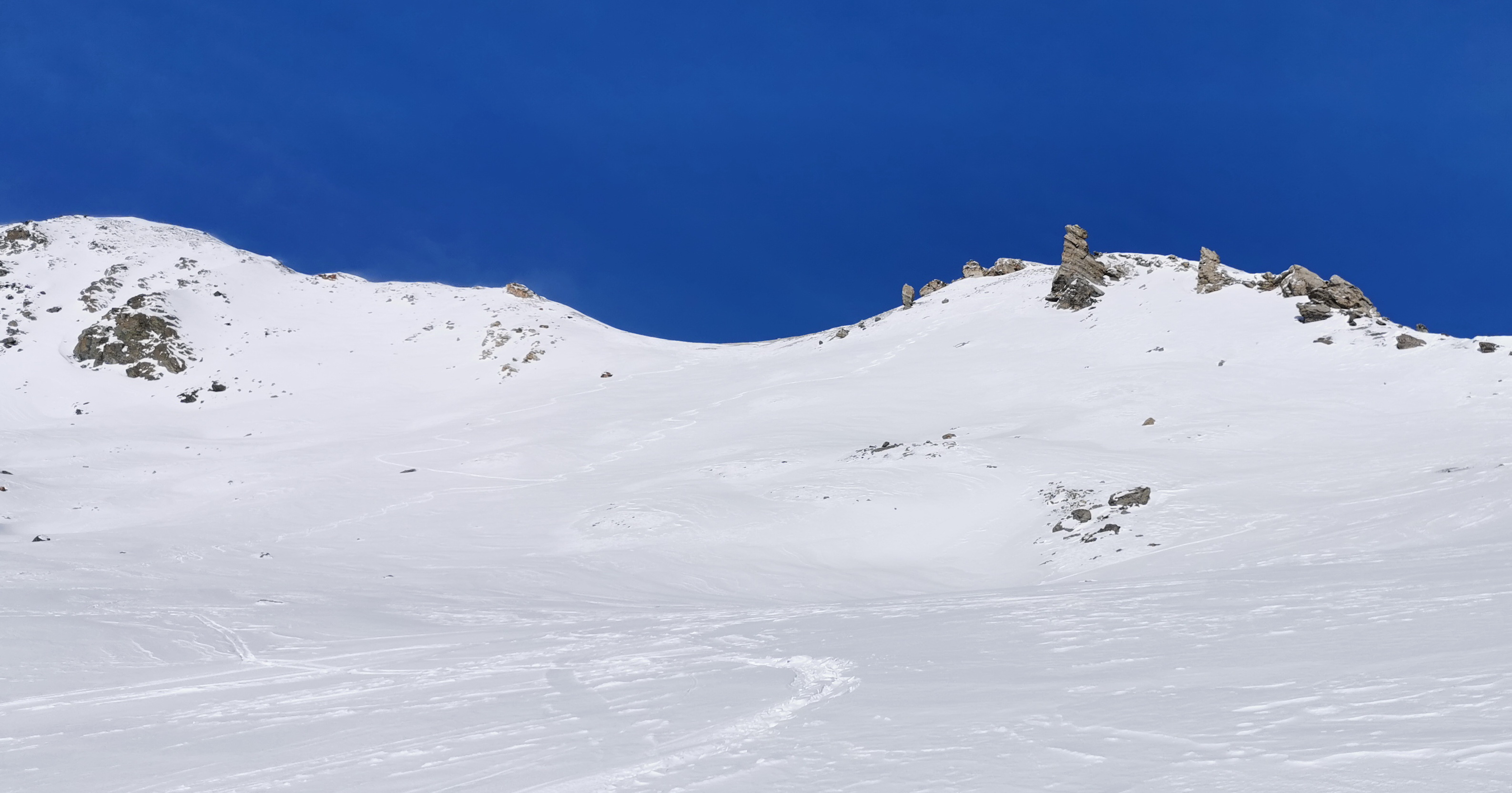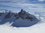 Vystúpim do sedla, už tradične je vyfúkané do skaly. Zlepím pásy, preklučkujem pomedzi kamene a po krátkom zjazde traverznem vpravo. Nalepím pásy a traverzujem na ľadovček v severe masívu Surgondy. Ufúkaná doska drží a tak sa rozhodnem vystúpiť na vrchol zo severu. Pozorujem staršiu lavínu, veľký odtrh. V závere stúpania na hrebienok musím kúsok popoliezť peši. Sneh je tu čistá krupica, alebo kryštálový cukor. Dôvod lavín a aktuánej nebezpečnej situácie.
