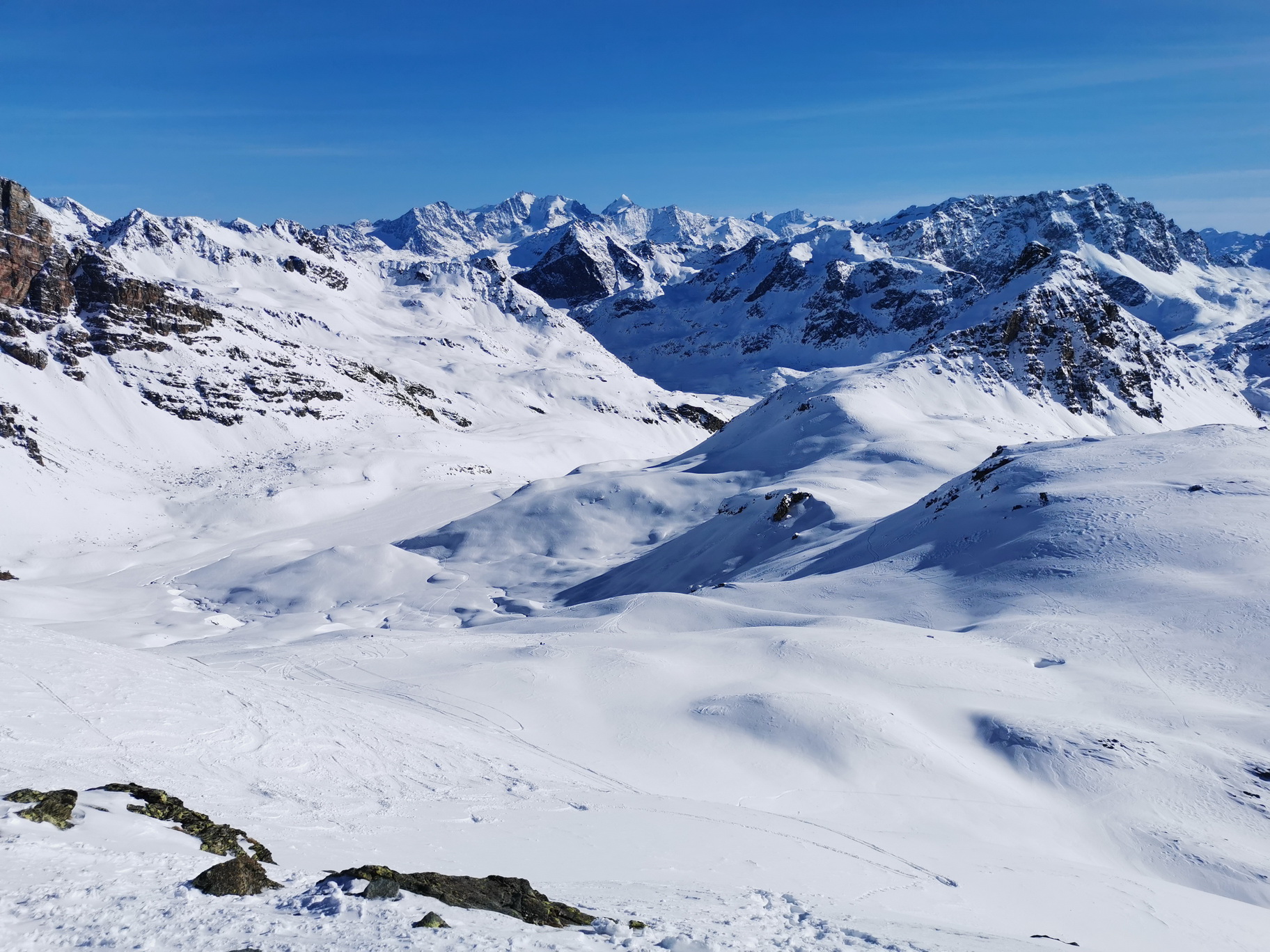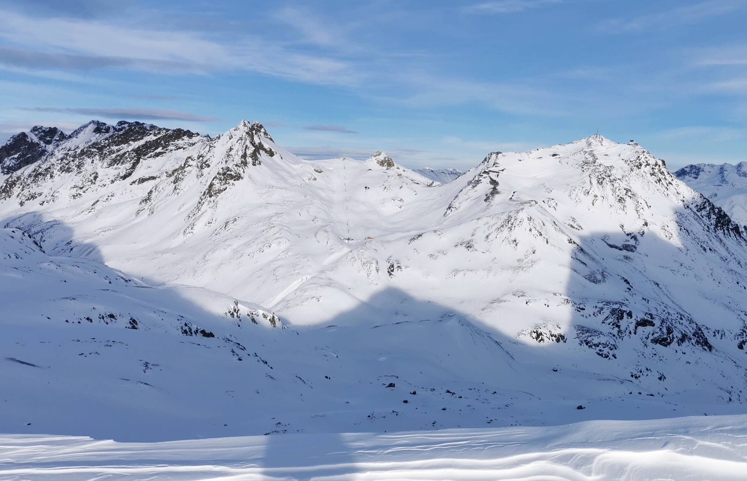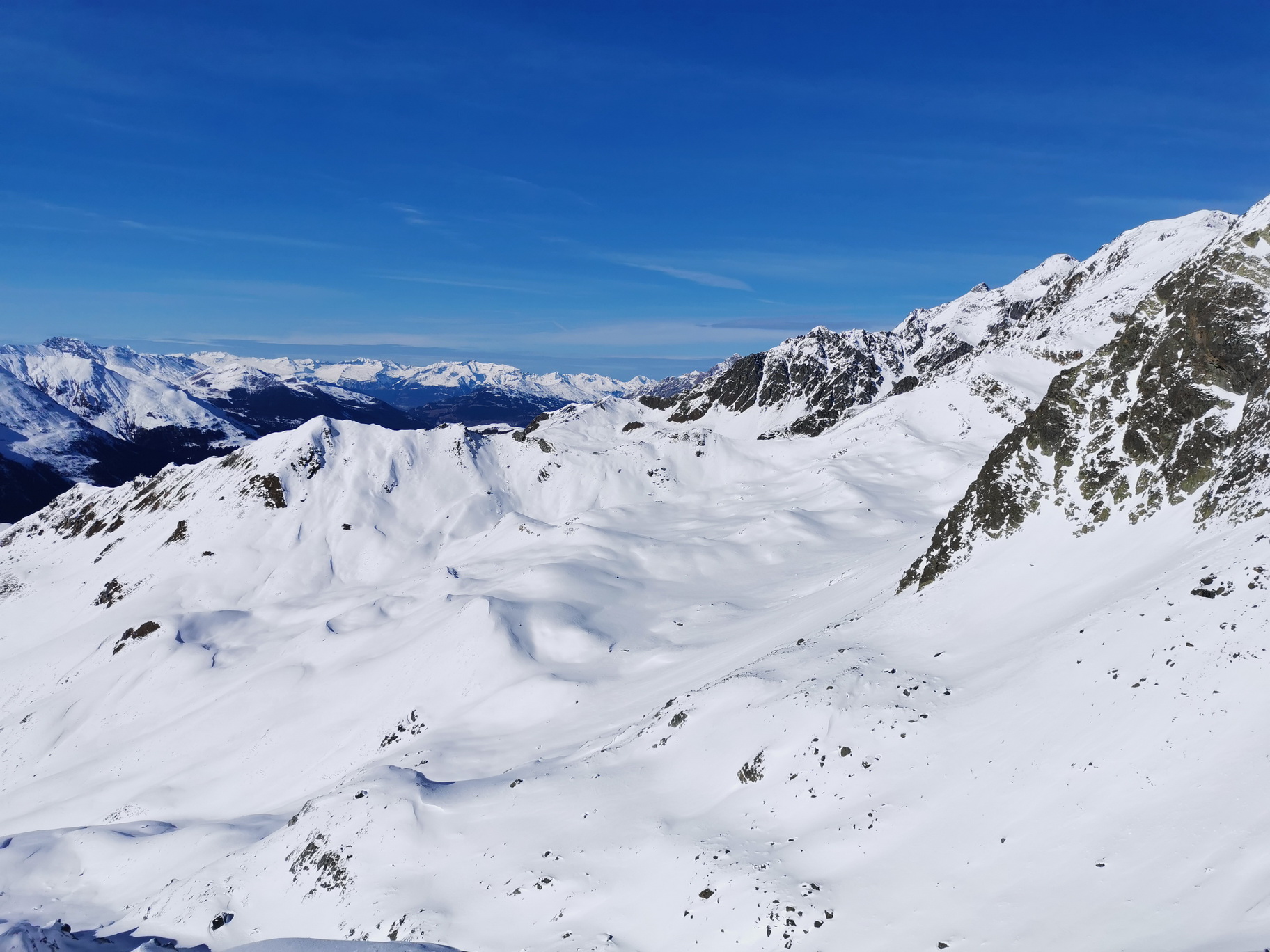 Vychádzam hore dolinkou, šlapem pomedzi kamene, dole sa síce bude dať zísť na lyžiach ale kameňáky tu majú silné opodstatnenie. Pokračujem smer Piz Surgonda. Stopy sú zafúkané a tak sa miestami nepríjemne prepadávam. Sneh je ako kryštálový cukor, nič príjemné a cukor striedajú tvrdé ufúkané dosky. Tie zase praskajú a vydávajú nepríjemné zvuky aj na rovine.