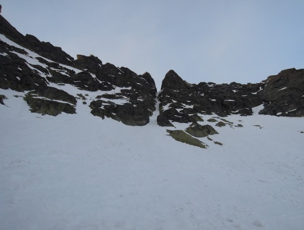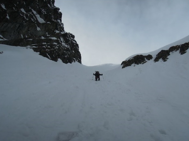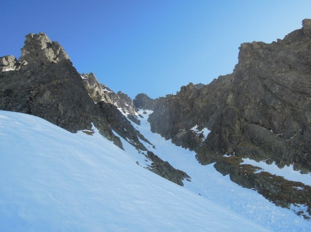 Výstup do sedla pod Drúkom vyzerá jednoducho, no ako náhle dáme dole pásy, presvedčíme sa o opaku. Elko na čele sa borí miestami po pás v snehu. Slnko už nemá takú silu a 16:40 sa púšťame do ďalšieho zjazdu. Do žlabu natraverzujeme príliš skoro a prebárajúci sneh nám dá riadne zabrať. Postupujeme peši a pol metrový odtrh v hornej časti nepridáva na pohode. Sedlo pod Drúkom nám zobralo dobrú pol hodinu navyše. Je asi päť hodín a ja mám prvýkrát chuť to zabaliť. Aďa nás opúšťa, no Elko ma prehovorí pokračovať.