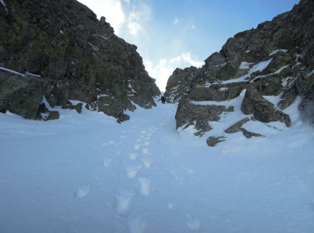 V hornej časti využijeme stopu od pešiakov a 12:15 opäť na slnku. Dobehne nás Aďa a tak v trojici mierime do Prednej Gerlachovskej lávky. Čaká nás veľká neznáma, o ktorej vieme len z fotiek. Najprv si však užijeme parádny zjazd zo Studeného sedla. Elko opäť diktuje tempo pri výstupe a tak stíham robiť len zopár fotiek. Žlab je síce úzky, ale komplet presnežený a navyše opäť v tieni s nosným snehom.