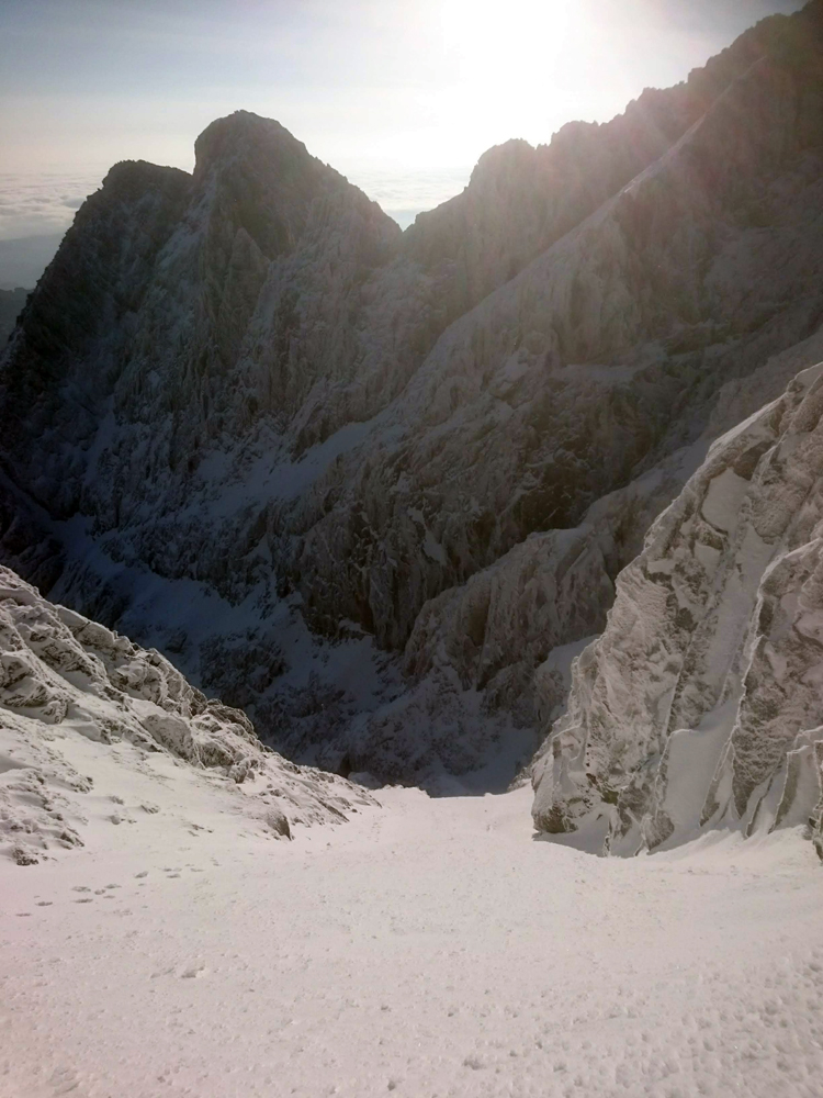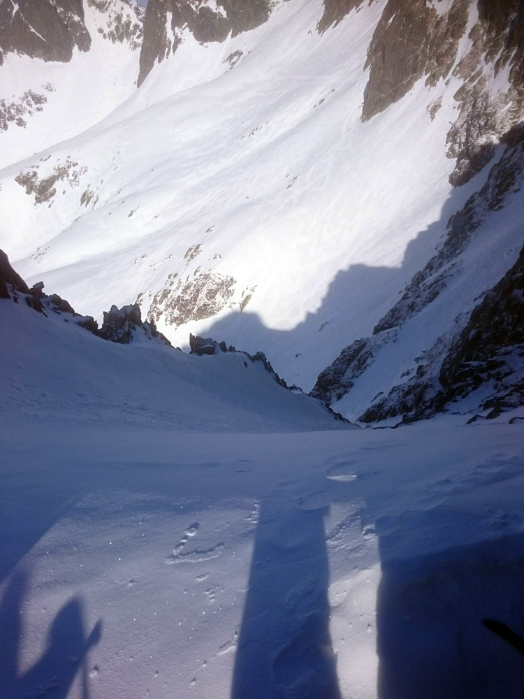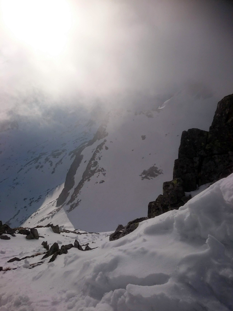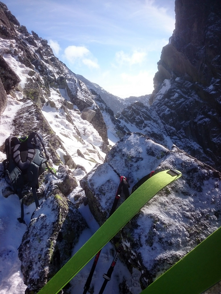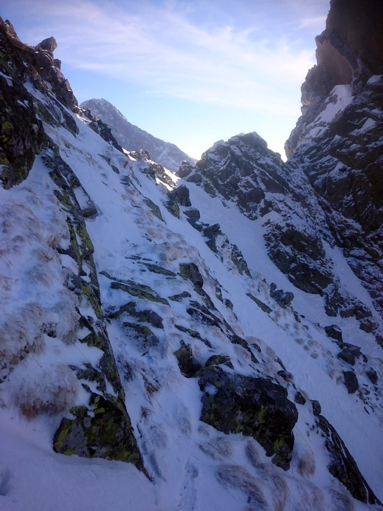 Idem na pásoch pokiaľ sa dá, je tu akási ľadová drť. Dávam mačky a hľadám líniu, kde sa to menej zabára. Konečne v sedle. Krátky odfuk a idem ďalej na mačkách (lyže neprichádzajú do úvahy). Vstup do žľabu: vidím prevej. Viem, že nižšie je to bez preveja, tak zostupujem. Obúvam lyže, prehupnem sa cez hranu a som v žľabe. Pocit nič moc, tak čo najskôr traverzujem cez rebro doprava.
