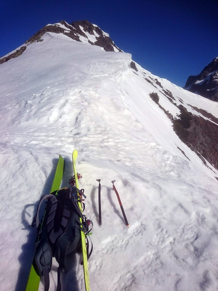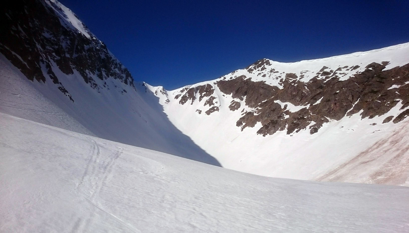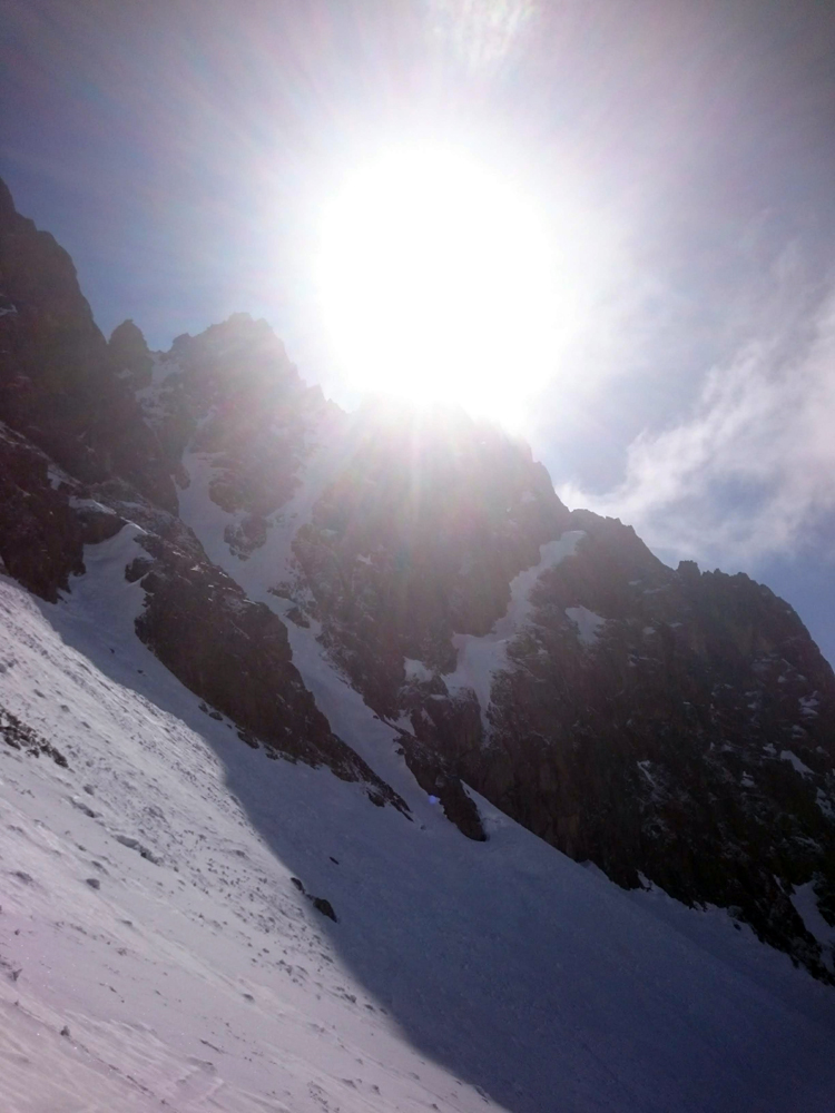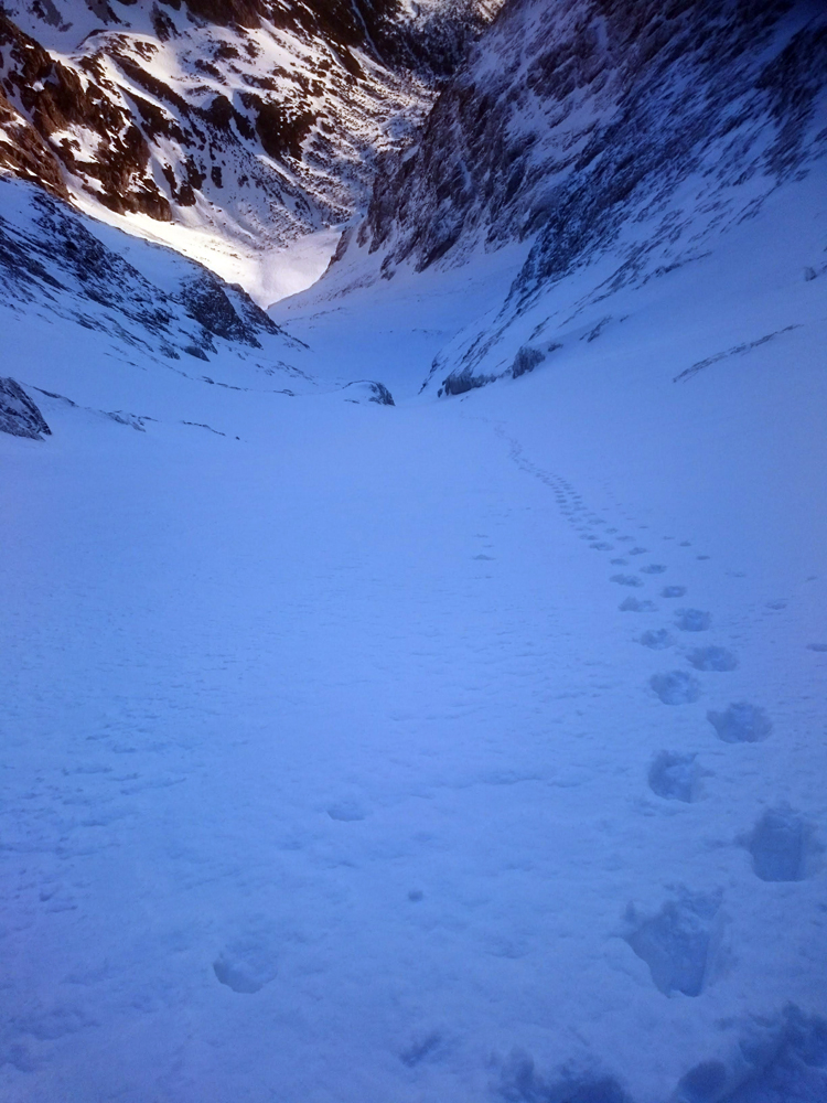 Idem na pásoch pokiaľ sa dá, je tu akási ľadová drť. Dávam mačky a hľadám líniu, kde sa to menej zabára. Konečne v sedle. Krátky odfuk a idem ďalej na mačkách (lyže neprichádzajú do úvahy). Vstup do žľabu: vidím prevej. Viem, že nižšie je to bez preveja, tak zostupujem. Obúvam lyže, prehupnem sa cez hranu a som v žľabe. Pocit nič moc, tak čo najskôr traverzujem cez rebro doprava.