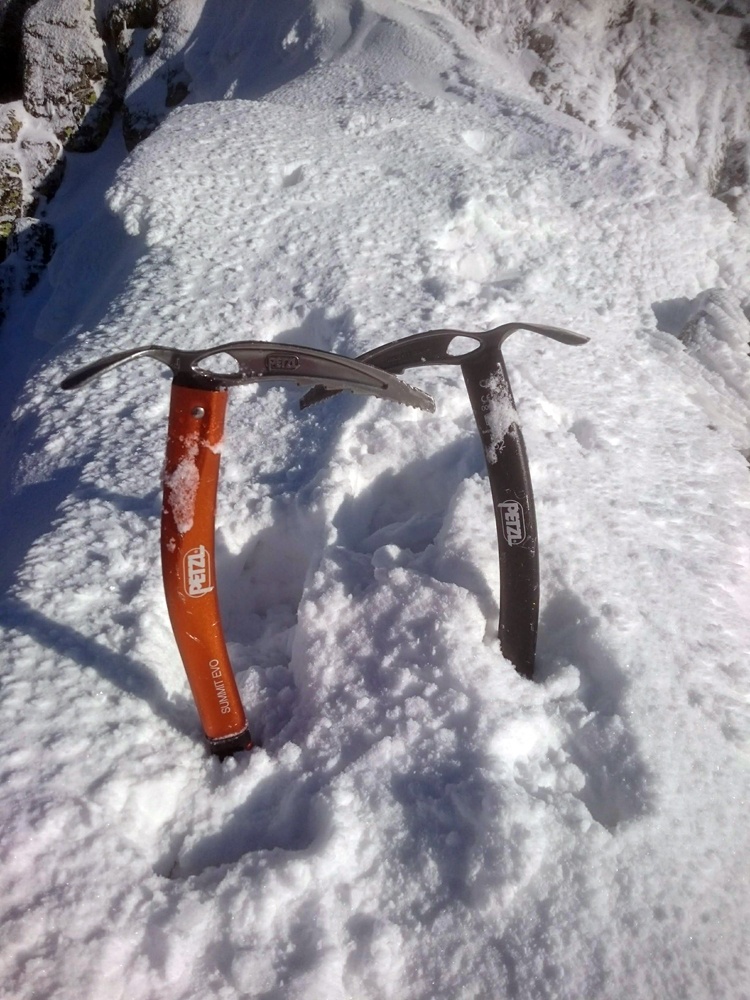 Obzerám sa, koľko stratím, Ypsilonka rozhodne, lebo viem, že ďalej to takto nepôjde. Odbočujem do Bachledky, svah pritvrdzuje, ukazuje sa prvý ľad. Beriem dva cepíny, idem ďalej. Dva ľadové prahy ma ale púšťajú celkom dobre. Konečne sedlo, stratu odhadujem na hodinu. Do MSD robím slalom pomedzi rozkotúľané a zmrznuté gule, na nich fúknutý prašan, asi 10 cm. Dá sa.