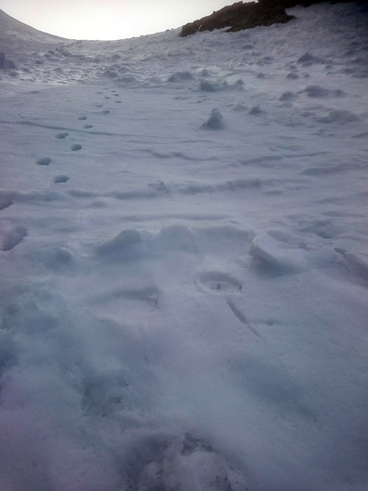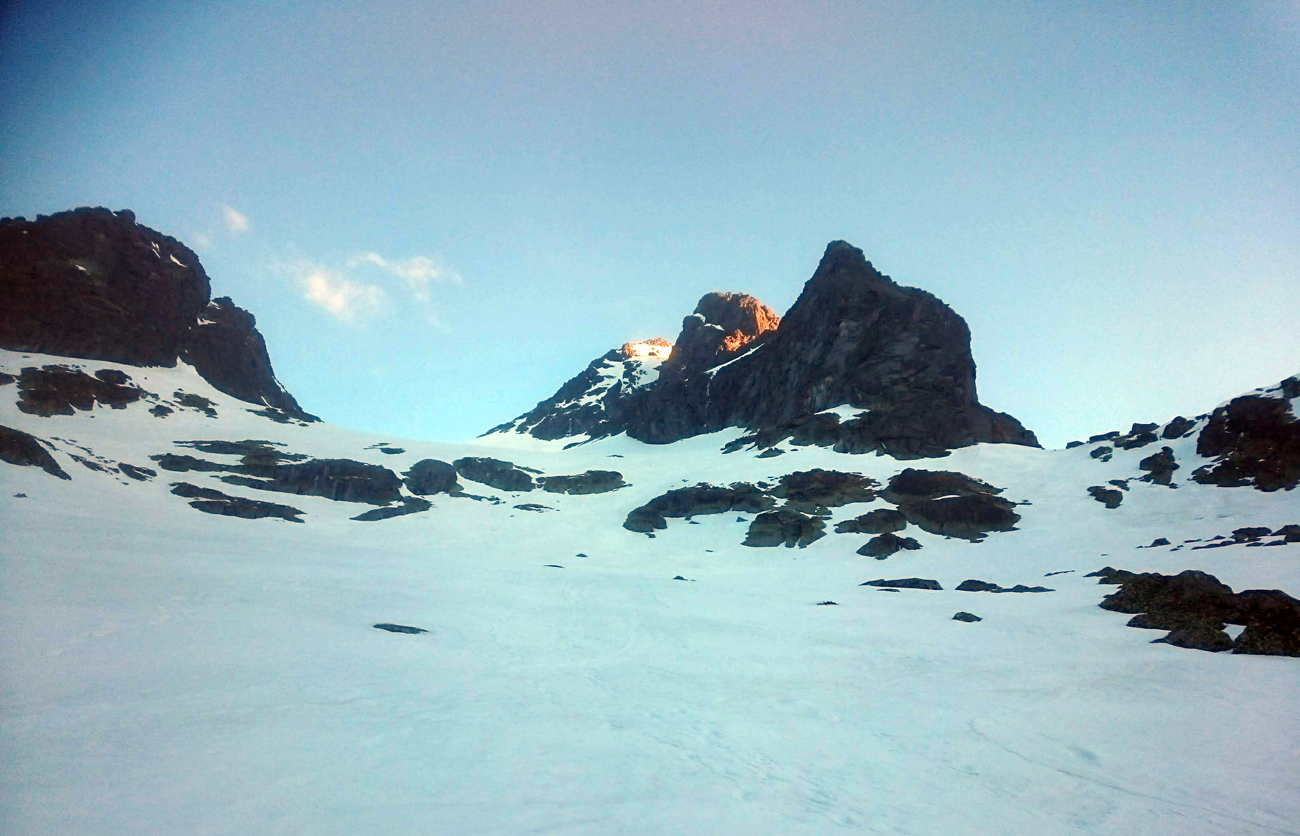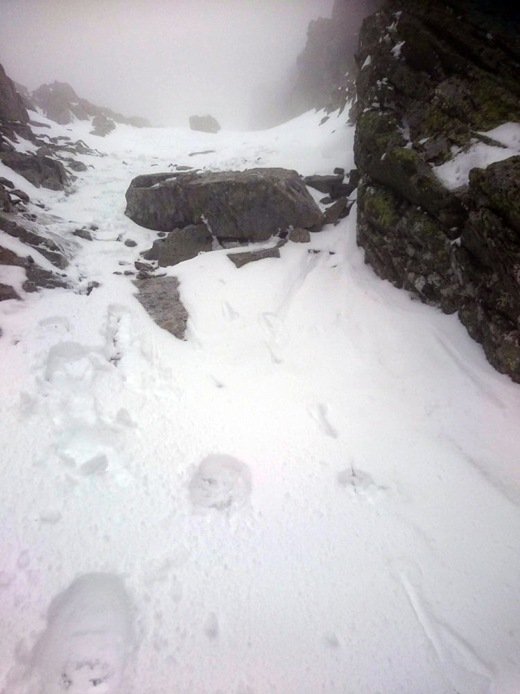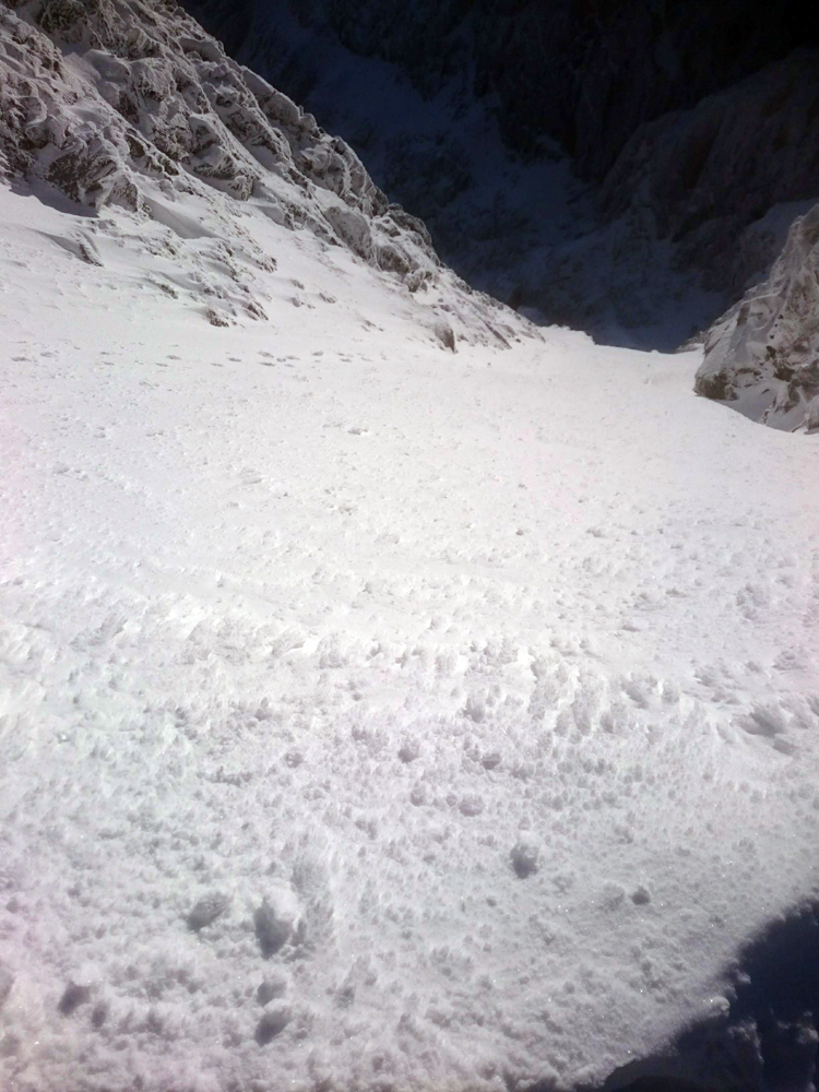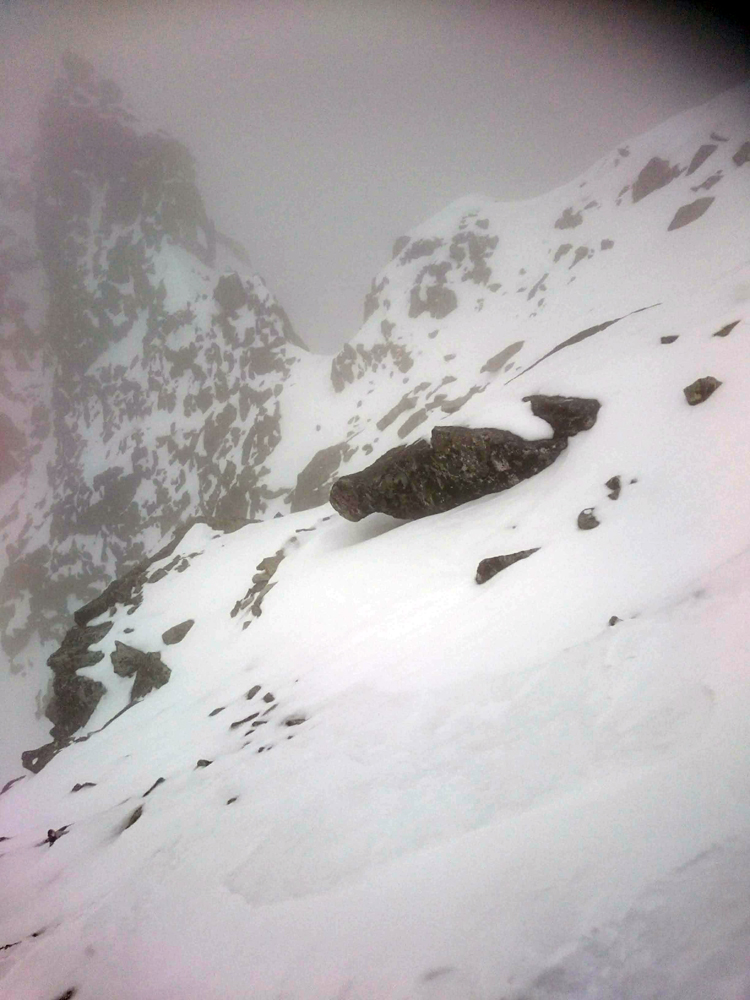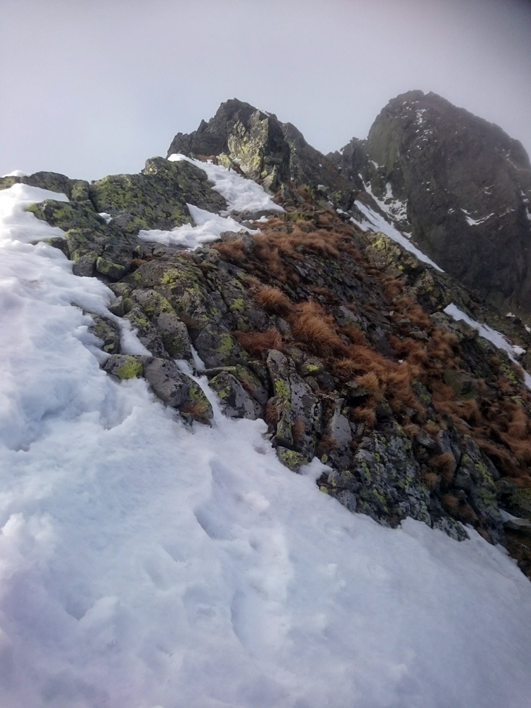 Pravou nohou po snehu, ľavou po skale a ťahám batoh na repke. Ide to. Druhý spád, pod snehom veľká bublina – pasca. Dá sa po skale, idem na istotu. Potom sa už venujem rozjímaniu a v pohode stúpam, sneh perfekt tvrdý. Občas poznať stopy po lyžiach a v duchu závidím autorovi oblúkov.