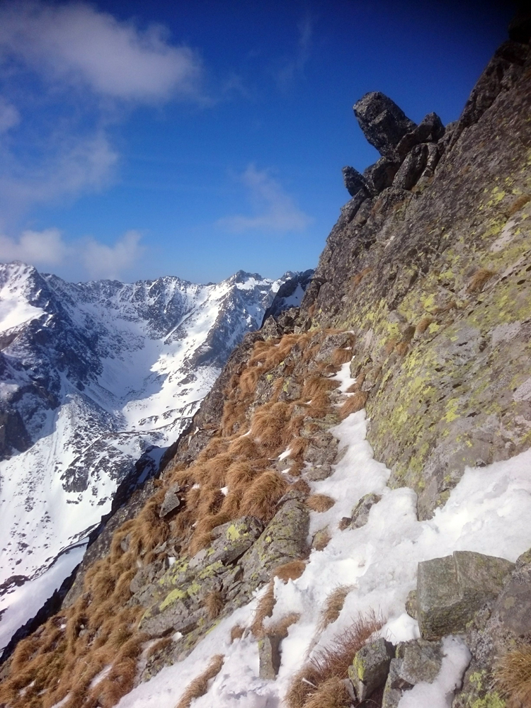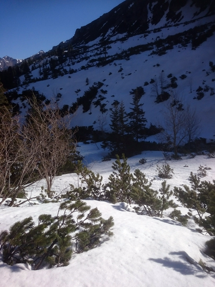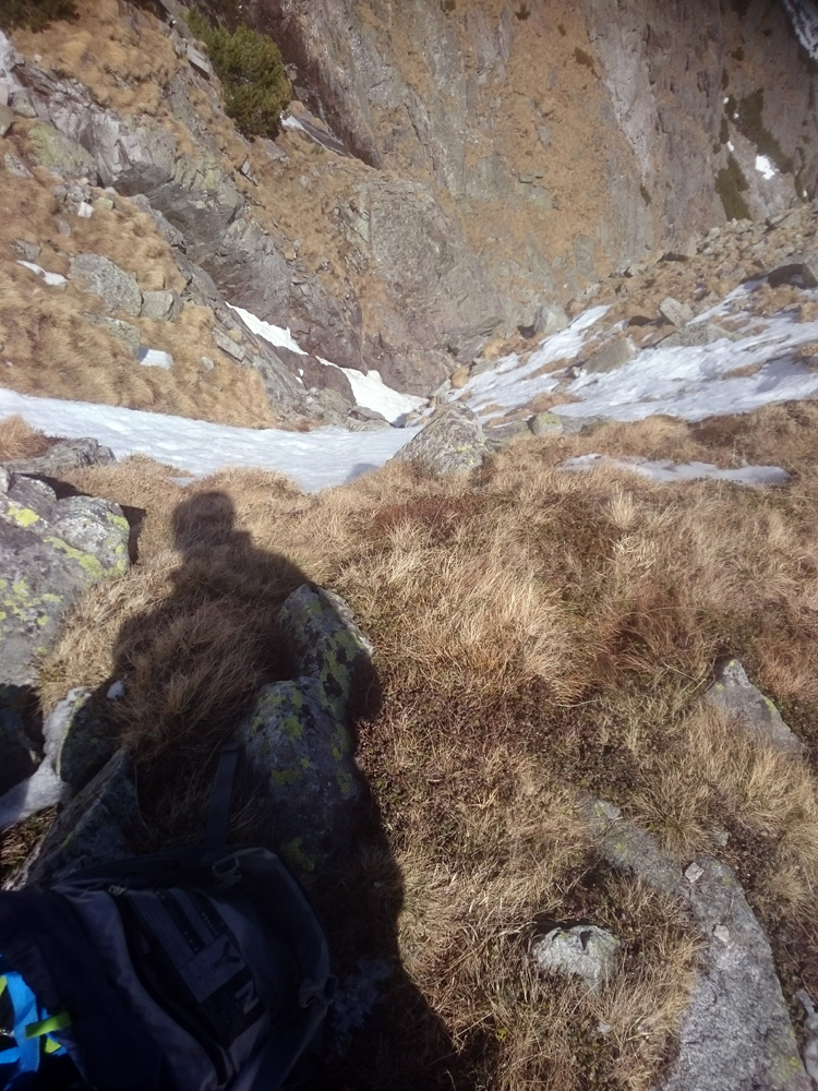 Dávam pásy a horným chodníkom sa vytraverzujem tesne pod hranu Czarneho stawu. Za plesom zastavujem, až keď treba prezúvať. Spodný traverz je na slnku, ale aj tak som mal v pláne horný variant, t. j. letný chodník, pod stienku po snehu. Stienka mokrá skala, v priamej línii je to mor. Dostávam sa nad a z opačnej strany vidím dve serpentíny chodníka. Ďalej pokračuje nepríjemný traverz okolo dvoch borhákov, orientačne som dobre.