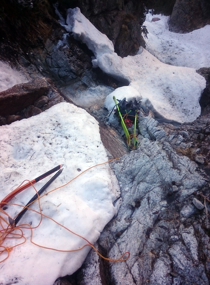 V sedle vyberám ukrytý matroš na zlanenie, uviažem 60-metrové lano na sólo zlaňák. Špekulujem, kedy ho zase prídem zmotať, tak dávam lano na polku. Už viem, kde je druhý štand, zlaním ku skobe s okom, cvaknem sľučku a problém: lano nejde stiahnuť. Nechávam na štande batoh a vydusím hore. Nevidím chybu, idem späť a zase to isté. Na druhý pokus prekladám lano inde a už to funguje. Pomaly sťahujem a ono vie, že ho drží amatér, tak zletí dole poza skalu a zase sa sekne. Keď nič nepomáha, dám do oka karabínu, lodný fix, Lano bolo za polkou, inak neviem... Zlaním ďalej do žľabu na mačkách na miesto, kde sa dajú obuť lyže, a obúvam.