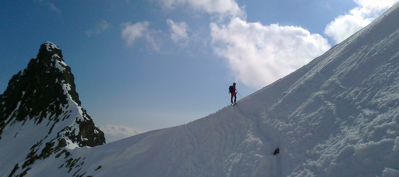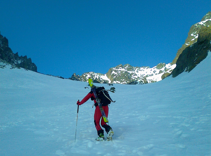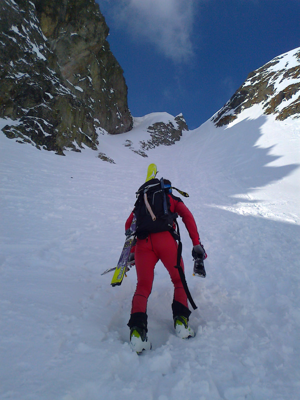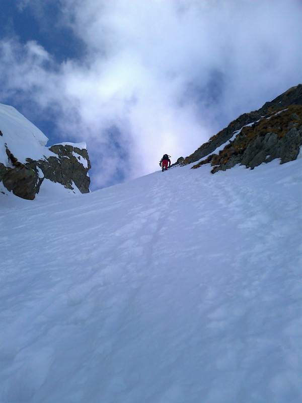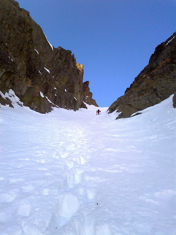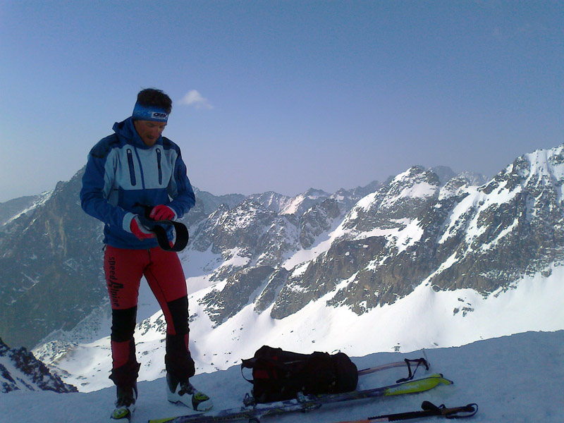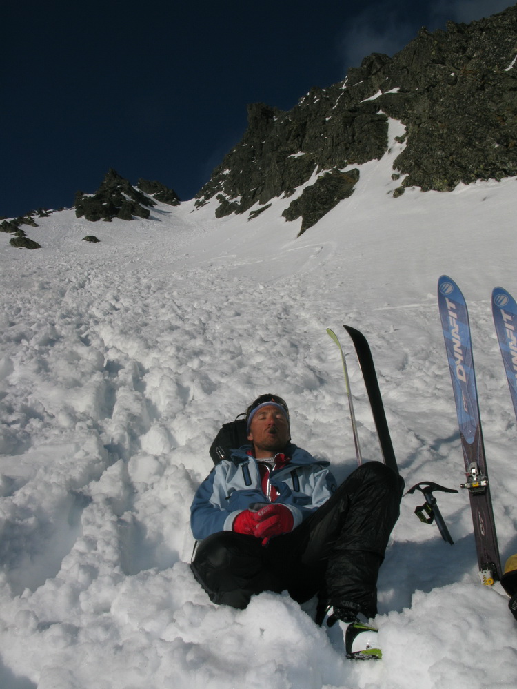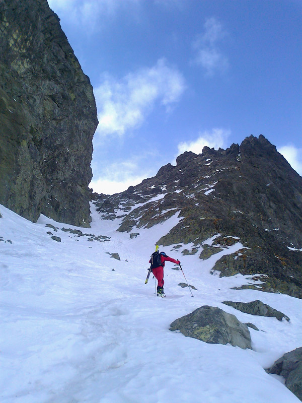 Na pásoch stúpame až tesne pod ňu. Modrá obloha v otvore brány je ako vstup do neba. Pár výškových metrov na pešo a sme hore. Prvý sa cez snehový prevej prehupne Maťo a mizne na druhej strane. Nie sú ani dve hodiny a my sme tu. Asi sa mi sníva. Šlo to celkom ľahučko. To čo iní chodia 2 dni, my sme prešli za pár hodín. Toto sedlo je posledným v tatranskej Haute Route. Ale deň ešte nekončí a ani my nie sme unavení, práve naopak. Maťo navrhuje pridať ďalšie sedlo. Prečo nie. Strhávame pásy a lyžujeme ľudoprázdnymi Zlomiskami, smer ďalšie sedlo.