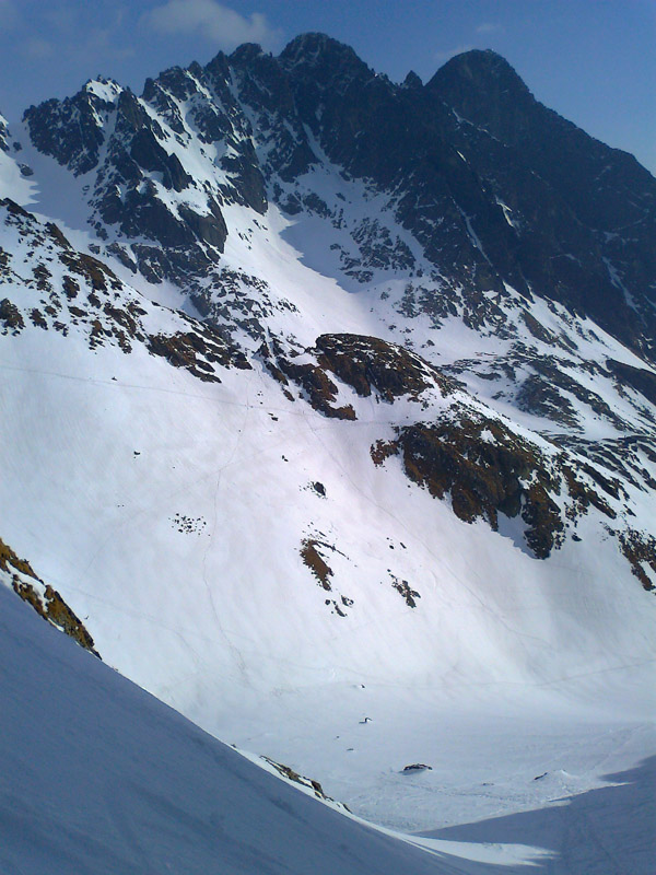 Na mačkách sme vystúpali až sem. S ešte stále nejasným plánom a cieľom pokračujeme ďalej. Zjazd a traverz poza Téryho chatu a popod Ľadové štíty. Podmienky aj počasie sú čoraz lepšie. Dostávame sa až pod stopu, vedúcu do Priečneho sedla.