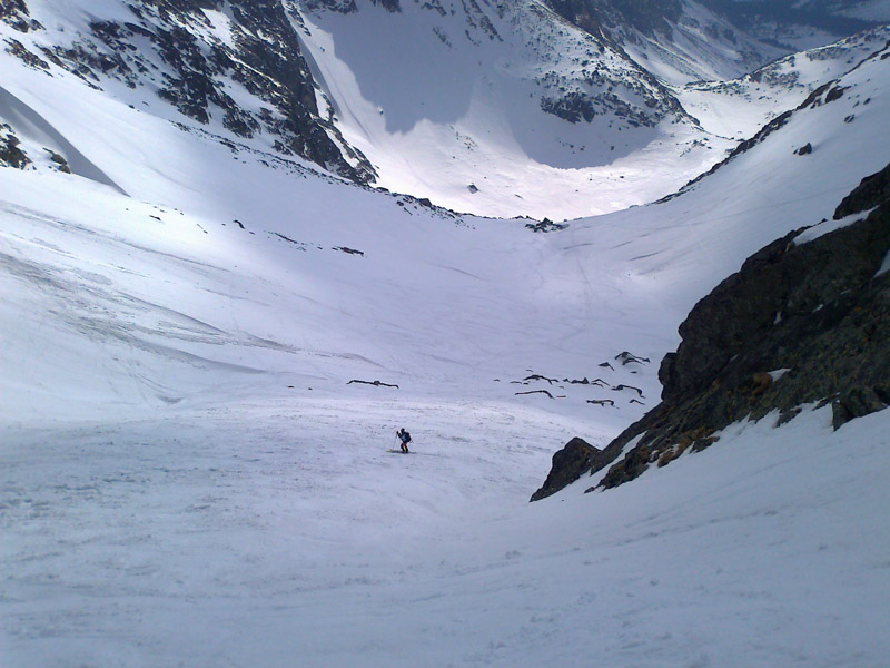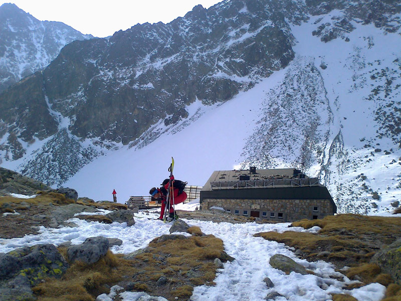 V závere stúpania je dobrá stopa a tak šliapeme bez mačiek. Výhľad zo sedla do Veľkej Studenej doliny otvára nové možnosti. Padá rozhodnutie. Dáme pokus o tatranskú Haute Route. Zamierime na Zbojníčku doplniť zásoby vody a energie. V prázdnej chate si posedíme asi 40 minút. Nikde nikoho, okrem chatára a personálu. Obúvame lyže a presúvame sa: smer Studené sedlo.
