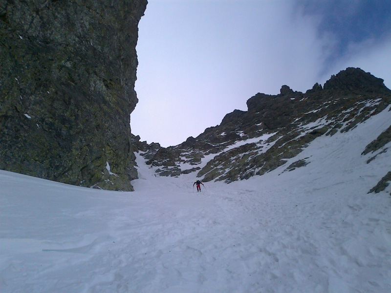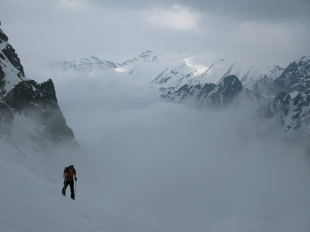 Nechávame to na ňu - na náhodu. Vyrážame smer Veľká Zmrzlá dolina. Kam, to stále nevieme. Je trochu zamračené, cez Belianky sa prevaľuje veľký mrak. Sneh pod nami je zmrznutý, dávame na lyže mačky a šliapeme hore Fľaškou. Nie je to až také zlé s tým počasím. Sem tam vykukne nádejný fľak modrej oblohy. Po víkendovej invázii turistov je dolina prázdna a tichá.