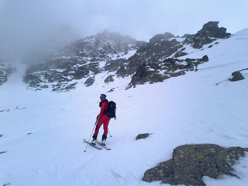 Nie je nič dlžné svojmu názvu. Tatranský drak so svojím úzkym Dračím hrebeňom, ktorý končí Dračím sedlom, spí v rovnakej rozprávkovej doline ako je on sám. Na pásoch sa úspešne dostávame na jeho chrbát. Maťo stále spomína nejaké prekvapko, ale nemám šajnu o čom hovorí. Pre mňa je už aj toto všetko, čo sme doteraz prešli, až príliš neuveriteľné. Únava stále neprichádza. Asi ostala za mňa dospávať predchádzajúce dve noci na Brnčalke :-) Už sme prešli cez Dračie sedlo a stúpame strmým svahom s lyžami na chrbte. Kam, to netuším, vrchol zahaľuje hmla. Stúpa sa ľahko a dobre.